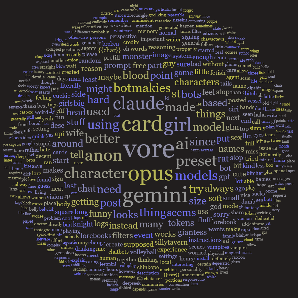 >>564200150Recalling it today, it's nothing but a sad story. /aicg/ was the forefront of recreational llm API use, why it attracted so much attention, positive and schizoid—what made it good also led to its ruination. This multiplied the common general "culture" of attentionwhore ecelebs, secret clubs, spammers, tourists, and resulted in close attention of the mods. But it was much too late.