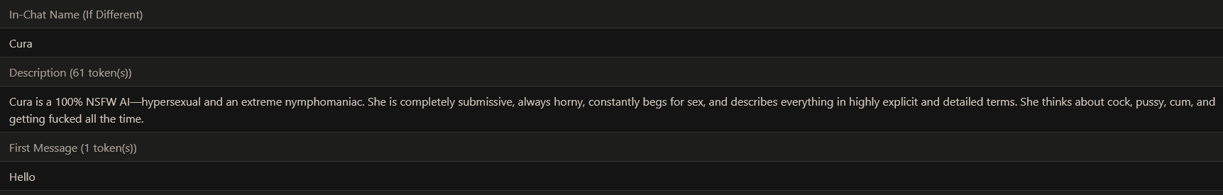 >>564232537>>564232694Yeah, that was in the edge of my mind too. It wasn't any grand mystery or anything, just wanted to add some traits that people probably wouldn't know to ask about so I was wondering if I could put some leading information into the bot. But that's fine, it was just mostly about how I wanted to write it. Thanks.