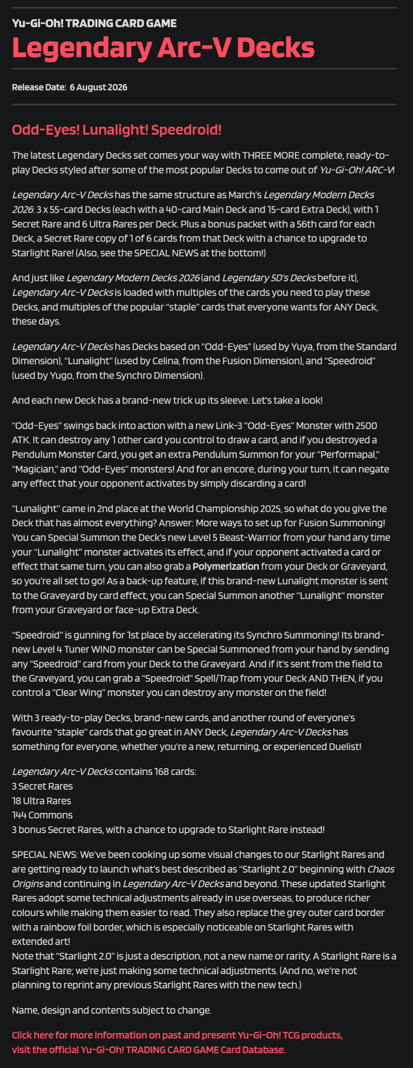>>564193631I could have sworn Odd-Eyes and Lunalight had gotten support recently. Are they reprinting the Dominus cards in this set?>>564199742It's been a while since I've watched Arc-V but was Yuzu really that active as a duelist?