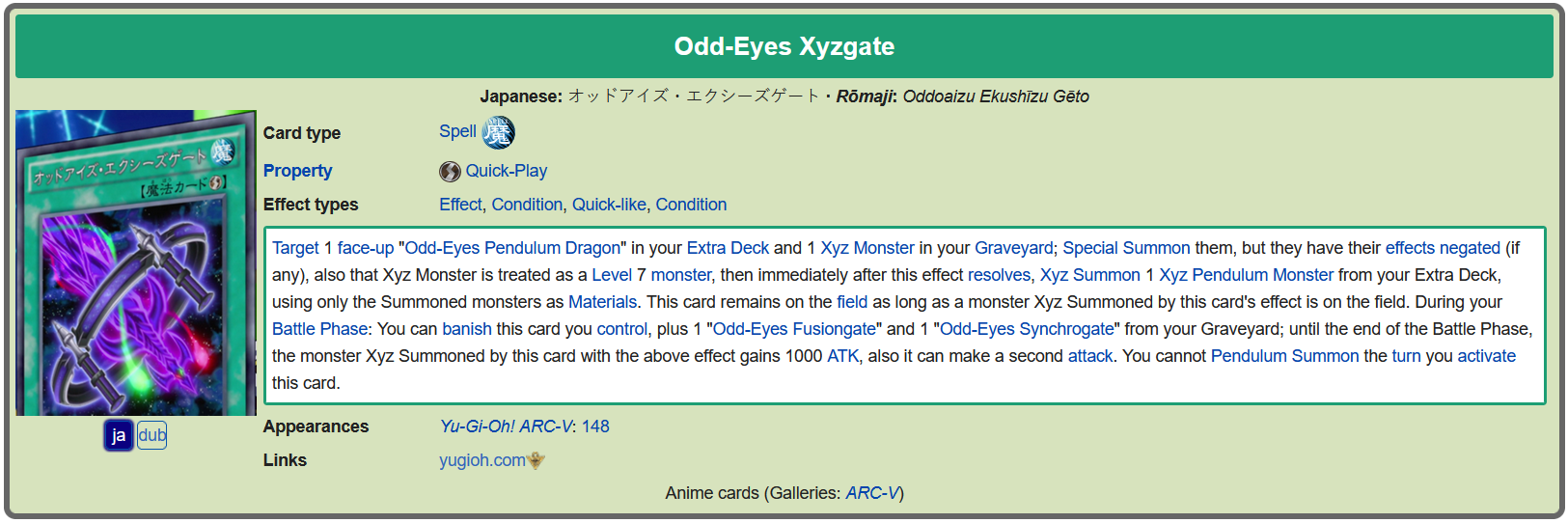 Odd-Eyes Xyzgate>Spell/Quick-Play>Target 1 face-up Pendulum monster in your Extra Deck or Pendulum Zone and 1 Xyz monster in your GY, or Banishment; Special Summon 1 “Odd-Eyes” Xyz monster whose Rank is equal to that Pendulum monster’s Level/Rank, and if you do, attach those targets to that monster as material. If you targeted an “Odd-Eyes” monster with this card’s effect, your opponent can’t activate card or effects in response to its activation. If this card is in your GY: You can banish it; “Odd-Eyes” Pendulum monsters you control gain 1000 ATK and an additional attack during each Battle Phase this turn. You can only use each effect of “Odd-Eyes Xyzgate” once per turn.