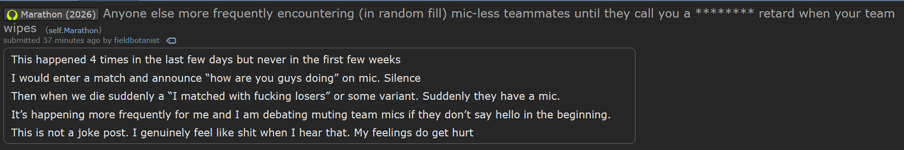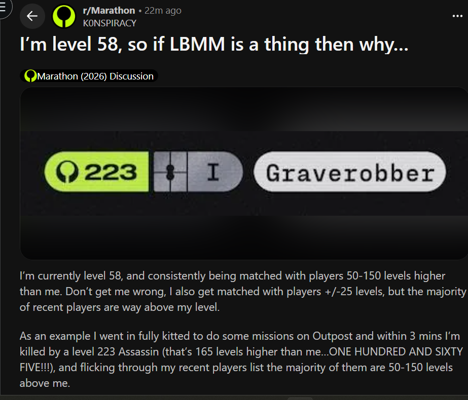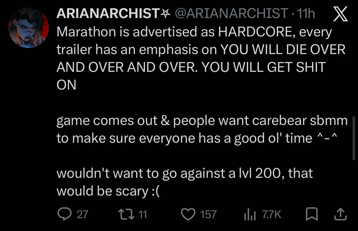 I truly don't believe Marathon is a bad game. I think where the mismatch comes in is that players in this day and age generally don't like heavy struggle. They don't like feeling helpless even though they aren't. I believe that gamers in this era have a very "I want the power fantasy of being all mighty no matter what." This is even shown in RPGs where your character can basically do everything and is never ever locked out quests etc because of stat checks or choices. The brain type / mind type of gamers is just.. changed. I don't know if its good or bad but gamers today just don't like feeling dunked on even though its a method to grow from. Its very strange to me because I like being challenged by games.