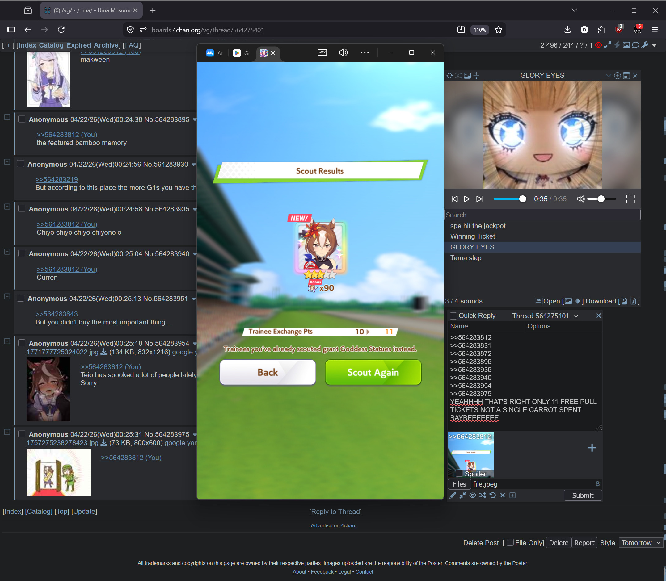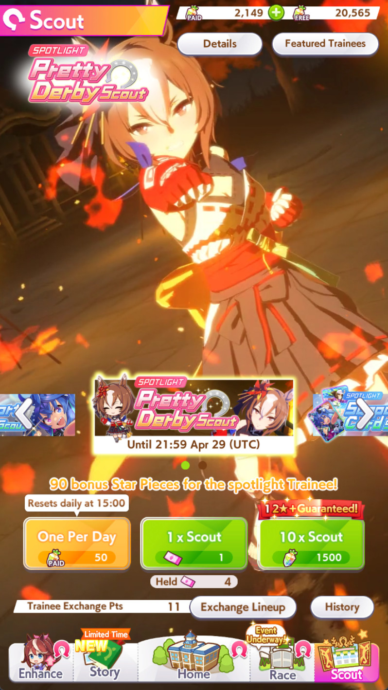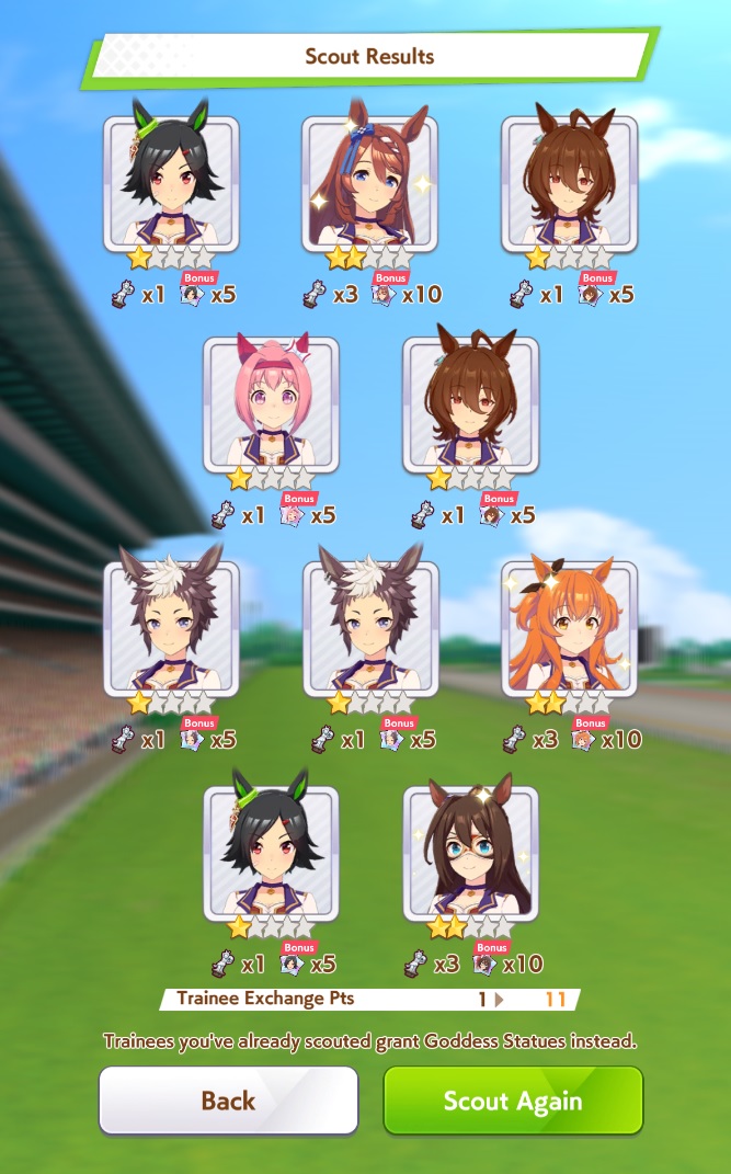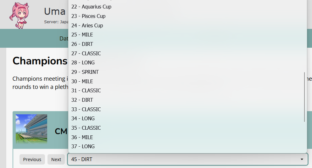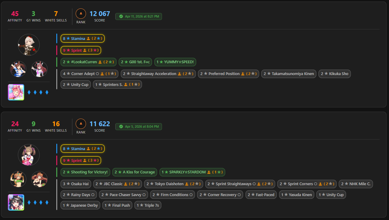 Previous: >>564261405>Global Game NewsLink your account to Cygames iDCurrent Scenario: Make A New Track aka "Trackblazer"Current Rate Up: Yaeno Muteki (3*), SSR Twin Turbo (Speed), SSR Ines Fujin (Guts)Current CM: Aries Cup - Nakayama Turf 2000m Medium/Right/Spring/FirmCurrent Event: Racing Carnival>Schedule04/26 - Golshi Week Celebration04/26 - Cheerleader Nice Nature (3*), Cheerleader King Halo (3*), Bamboo Memory (SSR), Seeking the Pearl (SSR)04/26 - Tracen Cheer Squad Story Event04/30 - Ines Fujin (3*), MR. C.B. (SSR), Tokai Teio (SR)https://pages.snep.pw/uma/anni-skill-changes>JP Game NewsCurrent Rate Up: Admire Groove (3*)New Scenario "Beyond Dreams" releasedTimeline: https://uma.moe/timelineCygames Webstore: https://webstore.cygames.com/en/umamusume_en>Thread Clubshttps://rentry.co/umaglobalclublistYou must be E3 (20k points) to join a circle. Apply with /uma/ or /vg/ in your profile or post ID in the thread.>All Guides & Resourceshttps://rentry.org/uma26Game databasehttps://gametora.com/umamusume (Click the gear to switch between JP / global server info)A basic guide for newfagshttps://rentry.org/umaglobalFind networks if your region is blocked from the game or clienthttps://www.umavpn.topSeiyuu & Concertshttps://rentry.org/umstUmamusume Birthday Calendarhttps://ウマ娘.攻略.tools/events/birthdayUma Texthttps://umareader.idsmile.xyzCustom Stickershttps://schizo.farm/resources/stickers