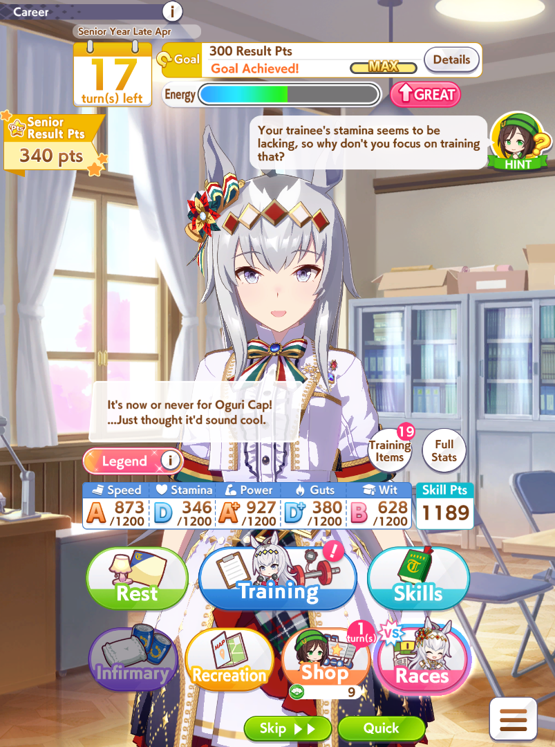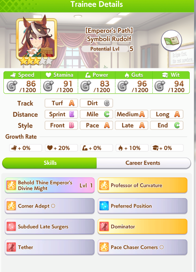 >>564277674I tested her and with restless you get kiss for courage to proc at the end of the midrace and if you have THH she gets in a good position to steal angling and zoomBut yeah, getting that grandparent Maru proc sounds annoying