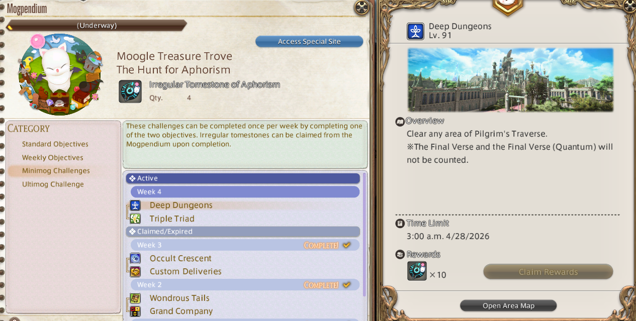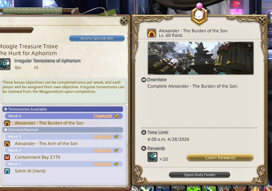 Yo>Moogle Treasure Trove - (March 31st -> April 28)https://na.finalfantasyxiv.com/lodestone/special/mogmog-collection/202603/lba1j4i815>Patch 7.45 Noteshttps://na.finalfantasyxiv.com/lodestone/topics/detail/2e8a10c44121af50ce86e1b605e10608e15f24d6>Patch 7.5 (April 28th) Preview Sitehttps://na.finalfantasyxiv.com/dawntrail/patch_7_5/>Resourceshttps://rentry.org/xivgresources>Meetups• April 21, 10:00 PM EST | Crystal, Mateus, The Goblet W27 Room 063 | "A Clockwork Orange" Movie Meetup• April 22, 9:00 PM EST | Primal, Famfrit, Lavender Beds W15 P20 | Spooky Club: Future Diary• April 24, 1:00 PM EDT | Goblin, Lavender Beds Ward 14 (10.5, 14.5) | FANFEST MEETUP >>564130605 • April 24, 5:00 PM ST | Alpha, Empyreum Hotsprings Ward 1 | EU FANFEST MEETUP >>564269443 • April 25, 9:00 PM EDT | Crystal, Goblin, Goblet, W2 P12 | Mario Retardy CPU Bets: Championship Edition >>563428709• April 25, 10:00 PM EDT | Dynamis, Cuchulainn | Empyreum W27 P52 | RP Speedmeeting >>562561983• April 26, 6:00 PM EST | LB14, Spring Queen Auction! >>564024336Previously: >>564310139