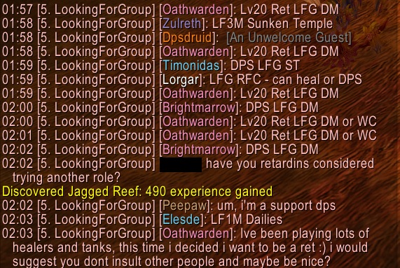 >>564332436>do /say troon>get bannednice server you got there just wait until you get to lvl 60you telling me I cant tank in full ret with a green 2h is transphobia and YOU WILL BE BANNED for that