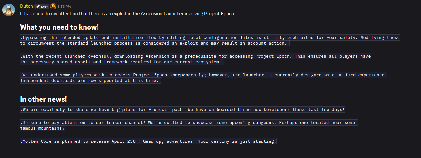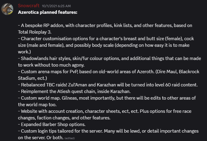 >>564348615the funnier part is i found azerotica through 4chan and the community ended up liking me for the 2 seconds i played lolthe admin is fun to talk to he's pretty open about the game and server tech, even goes into technical details if u want him to