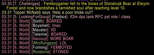 >>564331926Garbage serverits pretty hard to have moderation WORSE than blizzard but somehow epoop does itmind you, I've used chat at all maybe 5 times in total, and the only remotively offensive thing was tell a twink called "Tron" "more like troon"