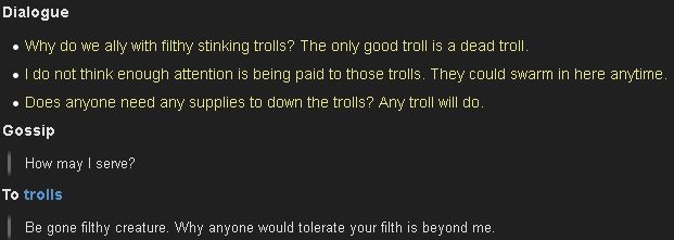 There was a blood elf vendor in TBC who hated trolls and refused to do business with them. Of course NuBlizz changed this in Midnight, but even just 1-2 expacs later we are told "the Horde is a family" constantly.https://warcraft.wiki.gg/wiki/PaelarinHis name is Pale Aryan lol.