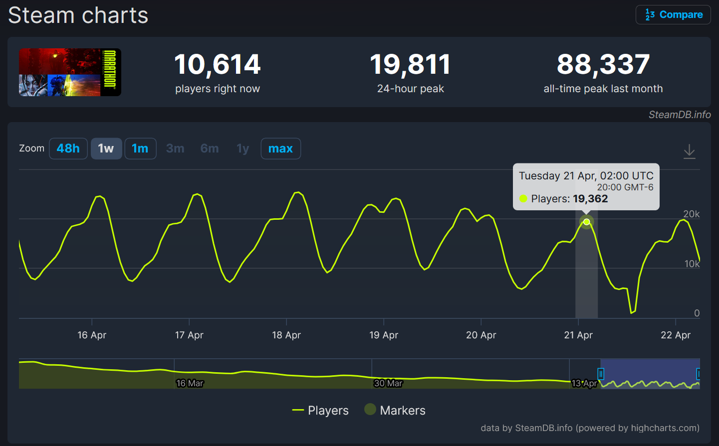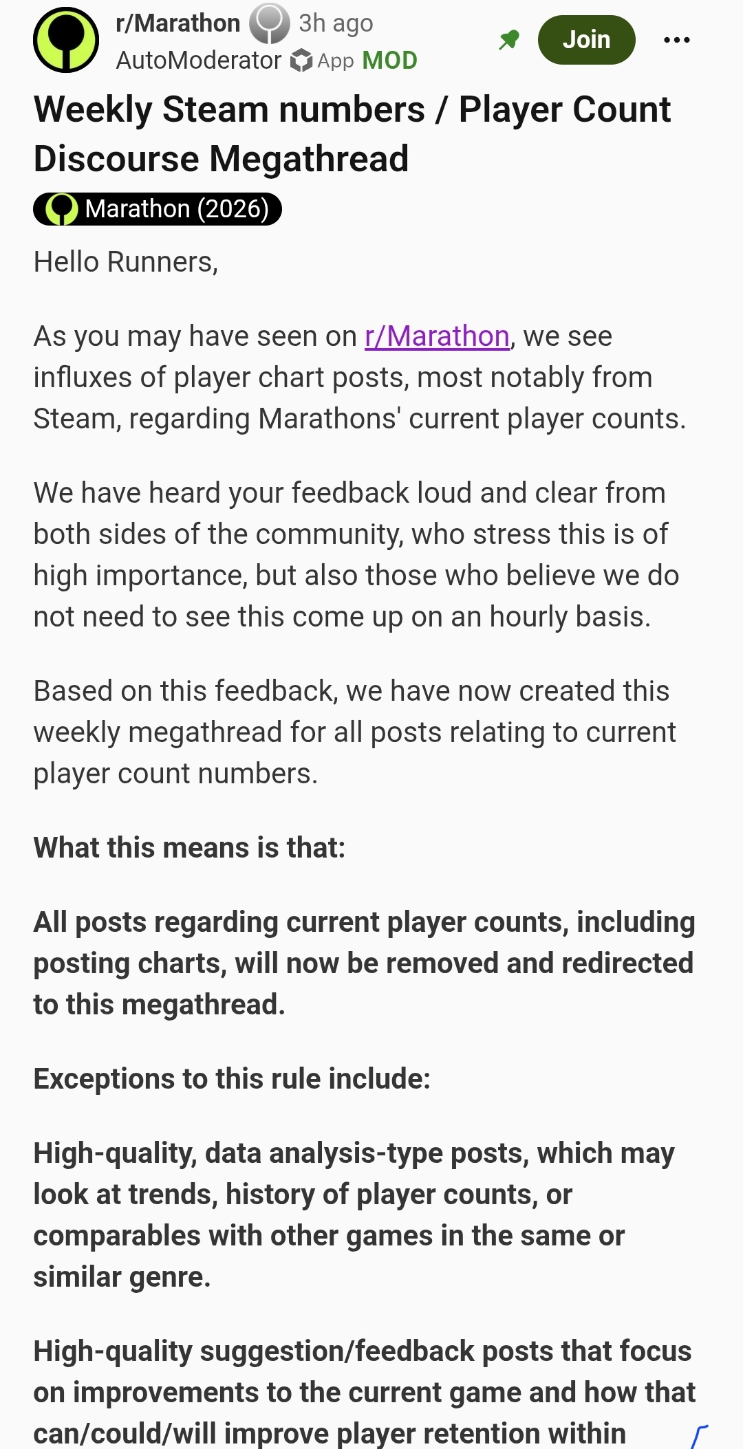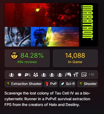 #1 Game on SteamDB>Marathon Youtube Channel:https://www.youtube.com/@MarathonTheGame>Game Info:https://store.steampowered.com/app/3065800/Marathon/>Marathon Game Home Pagehttps://www.marathonthegame.com/>The Entire History of Marathonhttps://www.youtube.com/watch?v=yu7uN6-lNhkhttps://marathon.bungie.org/story/>Play the Original Marathon for Freehttps://store.steampowered.com/app/2398450/Classic_Marathon/Databases:https://tauceti.world/https://tauceti.gg/https://marathonmeta.gg/https://marathondb.gg/News:>Mid-Season Updatehttps://www.bungie.net/7/en/News/Article/marathon_update_106>SEASONS & ROADMAPhttps://www.bungie.net/7/en/News/Article/introducing_seasons_marathon>Introducing C.A.R.R.I.https://www.bungie.net/7/en/News/Article/introducing_carri> 4/21 Updatehttps://www.bungie.net/7/en/News/Article/marathon_update_1061Previous run: >>564203460