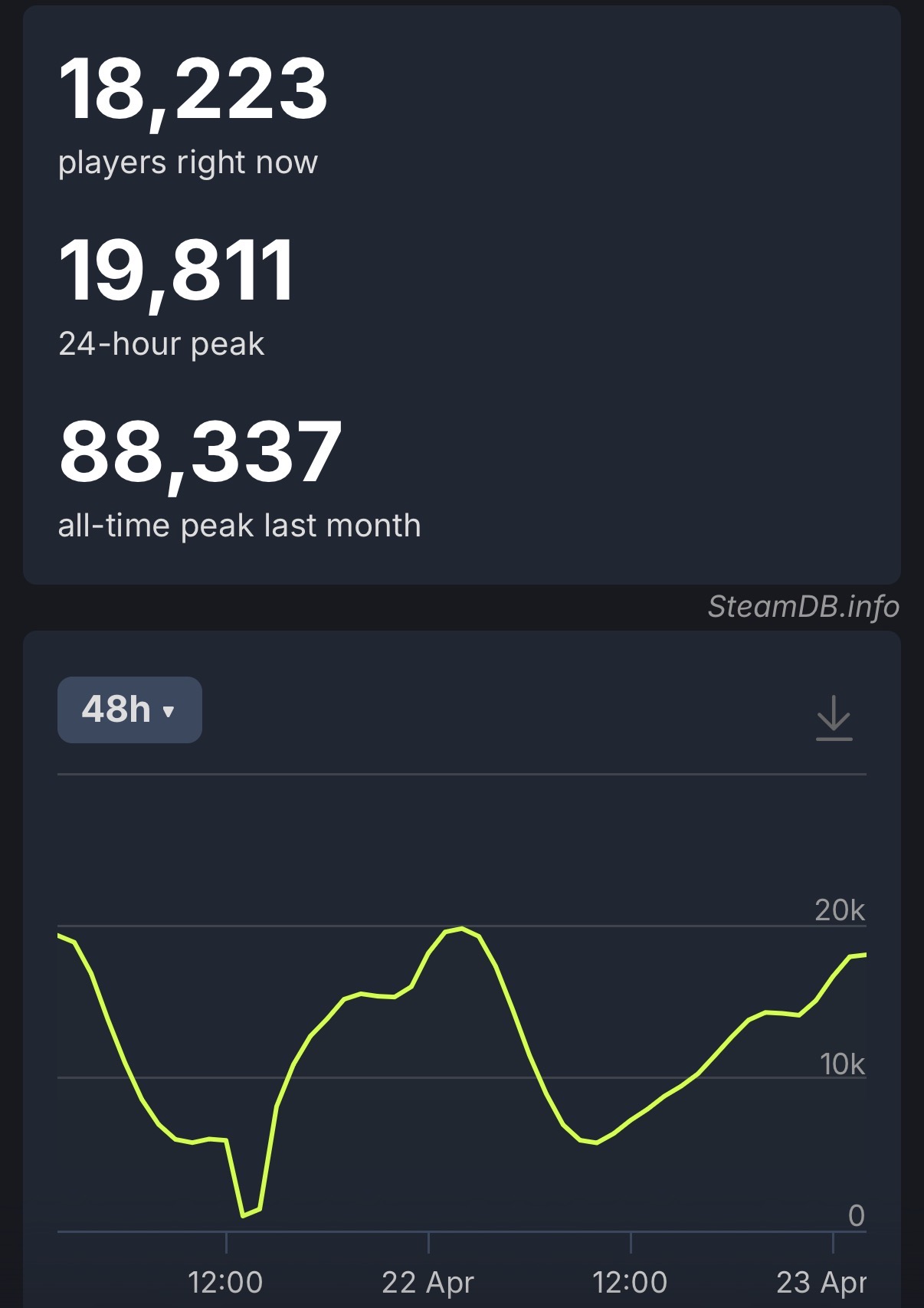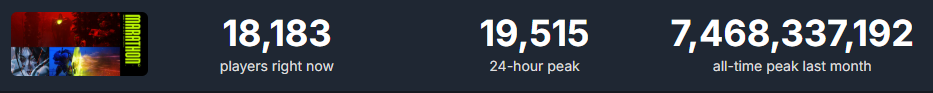 >449 bump over yesterday's peakI guess the sale didn't move the needle very much.What's next?And don't say F2P, because that would genuinely be disastrous. Makes the cheating problem 100x worse, while new players try it, realize they are just getting farmed by poopsockers, and leave, never to return