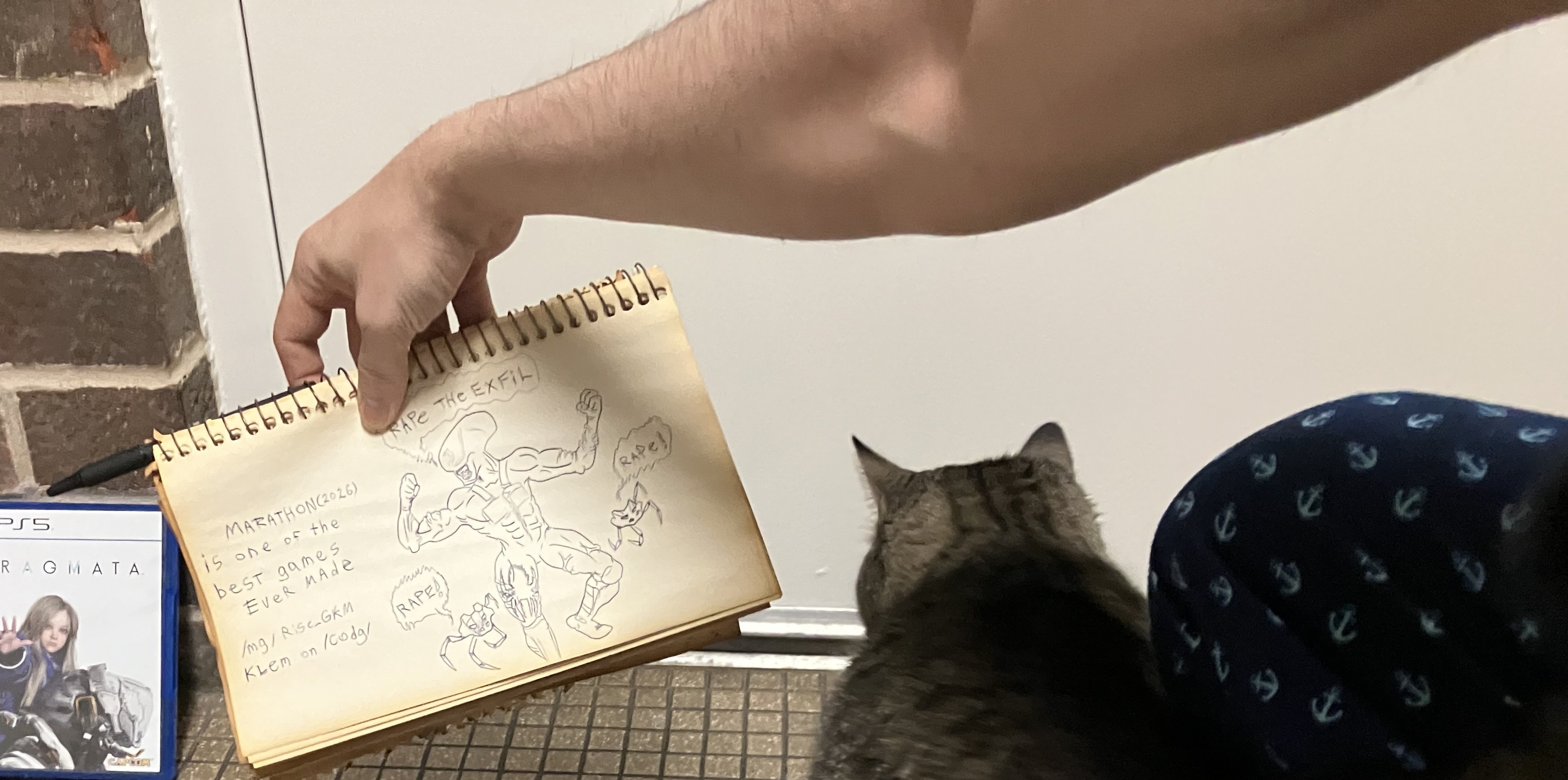 This guy just walks around town half naked with his cat, his little doodling notebook and his collection of ps5 games