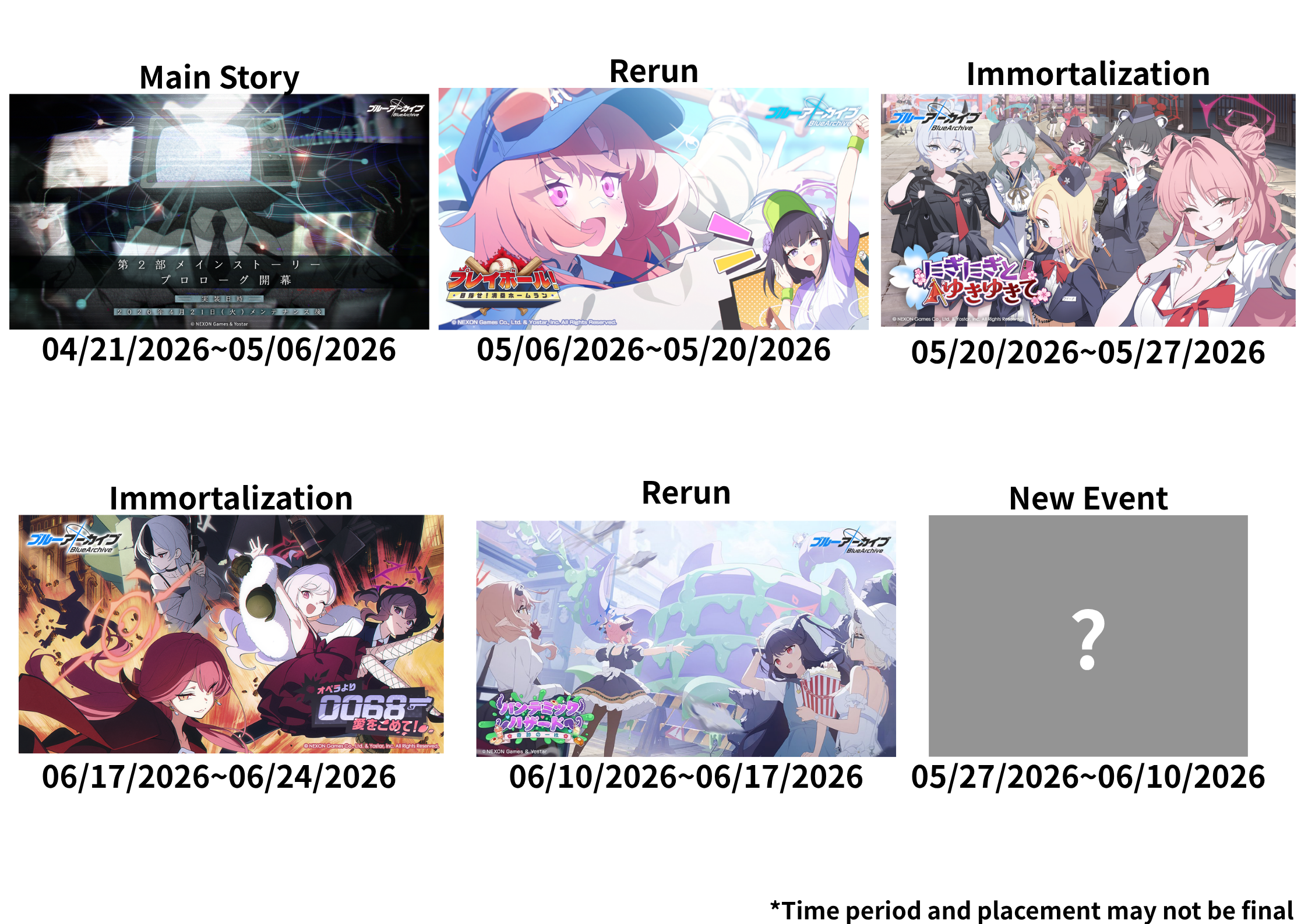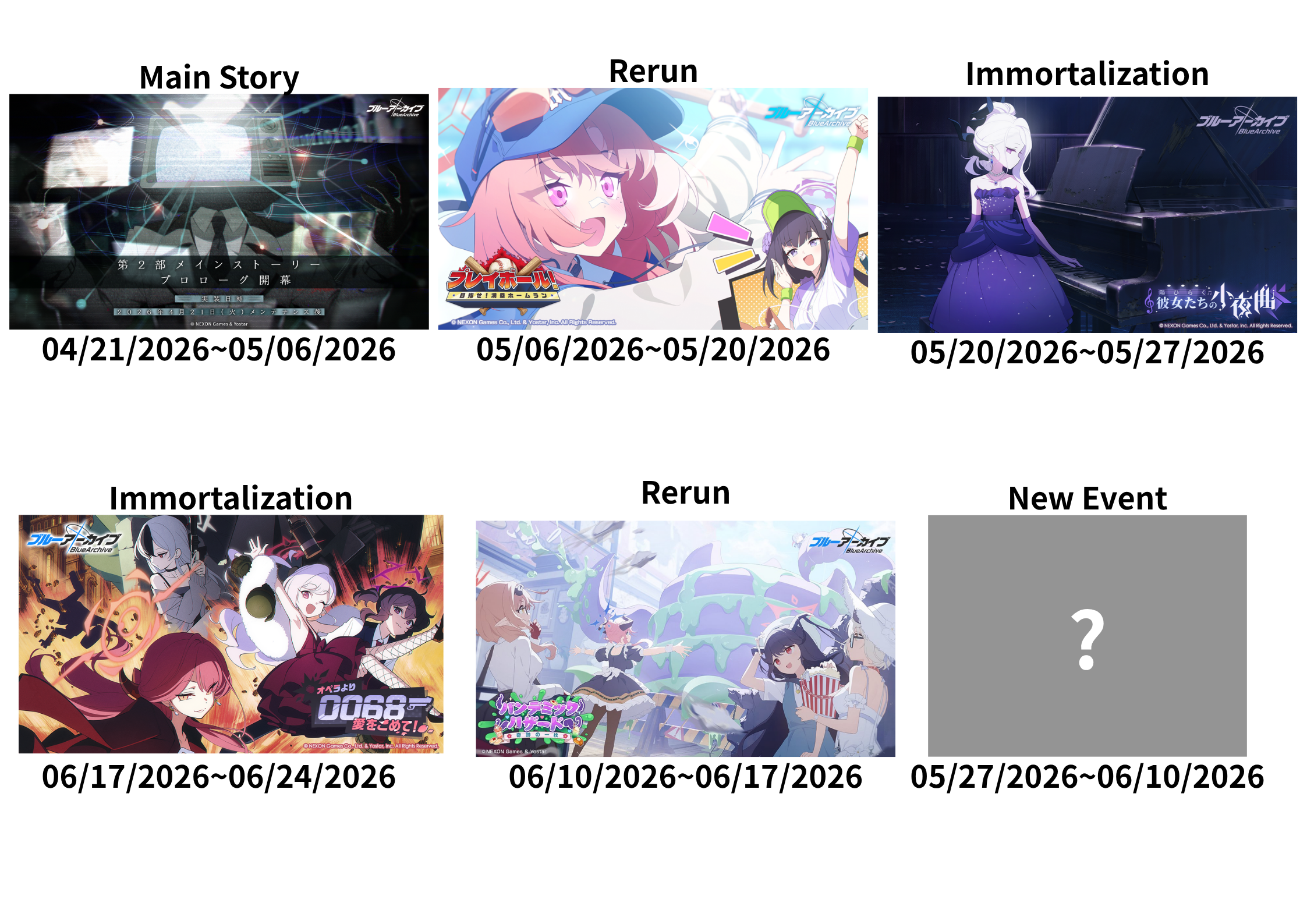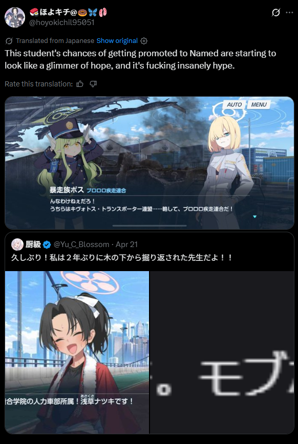 Previous Thread: >>564351654>Guides, Resources and useful links:https://rentry.org/bagguides>/bag/Circles/Clubs/Friends:https://rentry.org/holdingthebag>4koma, Manga, Side Content, PVs & Shortshttps://rentry.org/bacontent>>(JP) – JST>Banners:>4/21 After Maint – 5/6 10:59Niko (Limited)Kurumi (Limited)Otogi (Welfare)>News:Livestream Summary: https://rentry.org/4chanBagStream0419Patch notes: https://bluearchive.jp/news/newsJump/651>Events:Special Operation: Lore Pursuit – 4/21 After Maint – 5/6 10:59>Content:Total Assault: Kaiten (Urban) – 4/29 11:00 – 5/6 3:59Joint Firing Drill (Defense) – 5/6 11:00 – 5/13 3:59Limit Break Assault: Chokmah (Outdoor – w/Heavy Armor) – 4/22 11:00 – 5/27 3:592x Lesson/Scrimmage – 4/21 4:00 – 4/29 3:592x Account EXP – 4/25 4:00 – 4/27 3:592x Normal – 4/29 4:00 – 5/6 3:592x Account EXP – 5/2 4:00 – 5/7 3:592x Bounty – 5/6 4:00 – 5/13 3:592x Commissions – 5/13 4:00 – 5/20 3:592x Hard – 5/20 4:00 – 5/27 3:59>>(GLOBAL) – UTC>Banners:>4/21 After Maint – 4/28 1:59Mari (Pop Idol – Limited)Sakurako (Pop Idol – Limited)Mine (Pop Idol – Welfare)KahoKazusa>News:Patch notes: https://forum.nexon.com/bluearchive-en/board_view?thread=3425677>Events:Serenade Promenade – 4/21 After Maint – 4/28 1:59Balancing Schale's Books with the General Student Council – 4/21 After Maint – 4/28 1:59My Office: https://bluearchive.nexon.com/user/myoffice>Content:Grand Assault: Kaiten (Urban – Torment w/Heavy & Light Armor) – 4/21 2:00 – 4/27 18:59Limit Break Assault: Chokmah (Field – w/Heavy Armor) – 4/8 2:00 – 4/27 18:592x Lesson/Scrimmage – 4/20 19:00 – 4/27 18:592x Bounty – 4/27 19:00 – 5/4 18:592x Account EXP – 5/1 19:00 – 5/3 18:592x Normal/Lesson – 5/4 19:00 – 5/11 18:592x Account EXP – 5/8 19:00 – 5/10 18:59