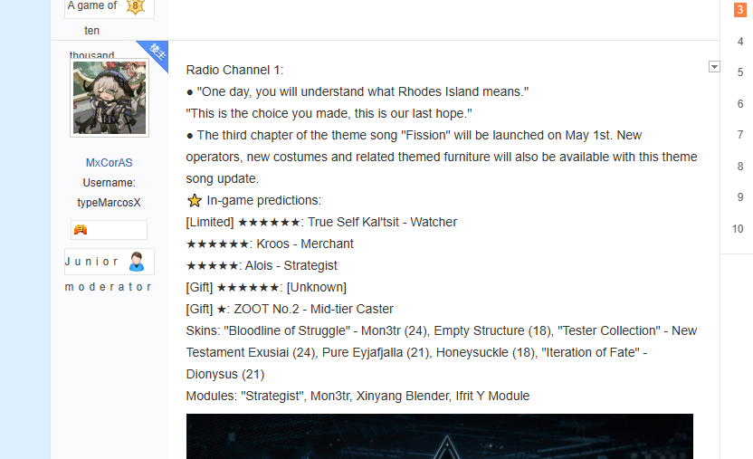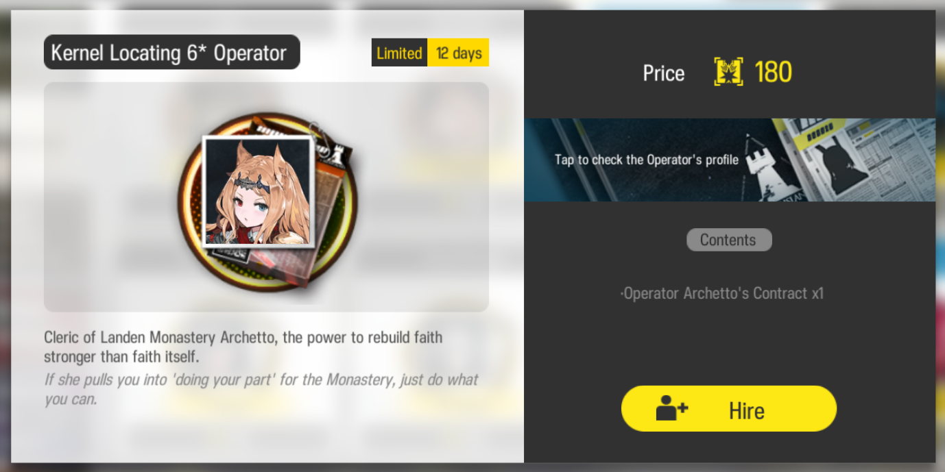 Previous thread: >>564342640Happy birthday to Hoederer and Sesa![4/25]CN stream (19:30 GMT+8): https://live.bilibili.com/5555734>CURRENT, FUTURE GLOBAL/JP/KR CONTENT:[4/10-4/24][Standard]6* Caster Lin, 6* Specialist Lee (Shop), 5* Vanguard Blacknight, 5* Supporter Alanna, 5* Guard Wind Chimes (Shop)[4/1-4/22]Icebreaker Games #2 - Chiave skin[4/14-5/5]Retracing Our Steps - 6* Supporter Astgenne the Lightchaser, 5* Guard Hadiya, 4* Caster Akkord[4/14-4/28][A Shared Oath of Guardianship]6* Vanguard SilverAsh the Reignfrost, 6* Caster Pramanix the Prerita, 5* Sniper Snow Hunter[4/14-4/28][Log-in]Estelle skin[4/14-5/12][EPOQUE & Test]Vina Victoria, Civilight Eterna, Ho'olheyak; Lappland the Decadenza[4/14-5/12]Mass skin reselling>CURRENT, FUTURE CN CONTENT:[4/9-4/23][Standard]6* Defender Penance, 6* Guard Mlynar (Shop), 5* Caster Tecno, 5* Supporter Sand Reckoner, 5* Vanguard Fang the Fire-Sharpened (Shop)[4/7-4/21]People, A People - 5* Supporter Botani[4/7-4/21][Rage of the Many]6* Zima the Raging Tide, 5* Medic Ukusik, 5* Vanguard Mitm[4/7-4/21][Ambiance Synesthesia]Nymph, Surtr[TBA][Ambiance Synesthesia]Lemuen, Necrass, Saria>/akg/ website:akgcc.github.io>AK EN Database:puppiizsunniiz.github.io/AN-EN-Tags/akhrchars.html>More valuable resources:rentry.org/akg_resources>/akg/ merch guiderentry.co/akg_merch>Pull calculatorhttps://imivi.github.io/arknights-pulls-calculator/