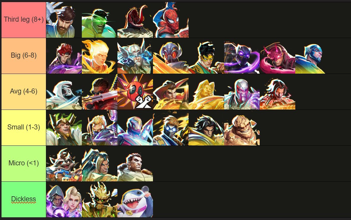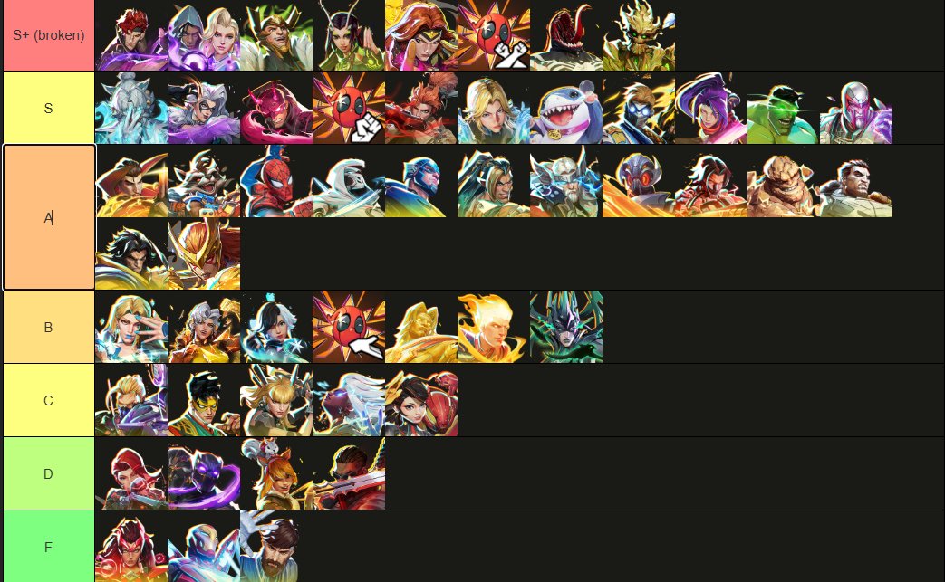 >>564381827Too high up:>Phoenix>post-nerf Tankpool>Mantis>Loki>White Fox>DPSpool>Spiderman>Thor>Emma>WidowToo low:>Fantastic>Black Panther>Blade>Hawkeye>Iron Fist>Magik>DaredevilA better list than Bogur's but not by much
