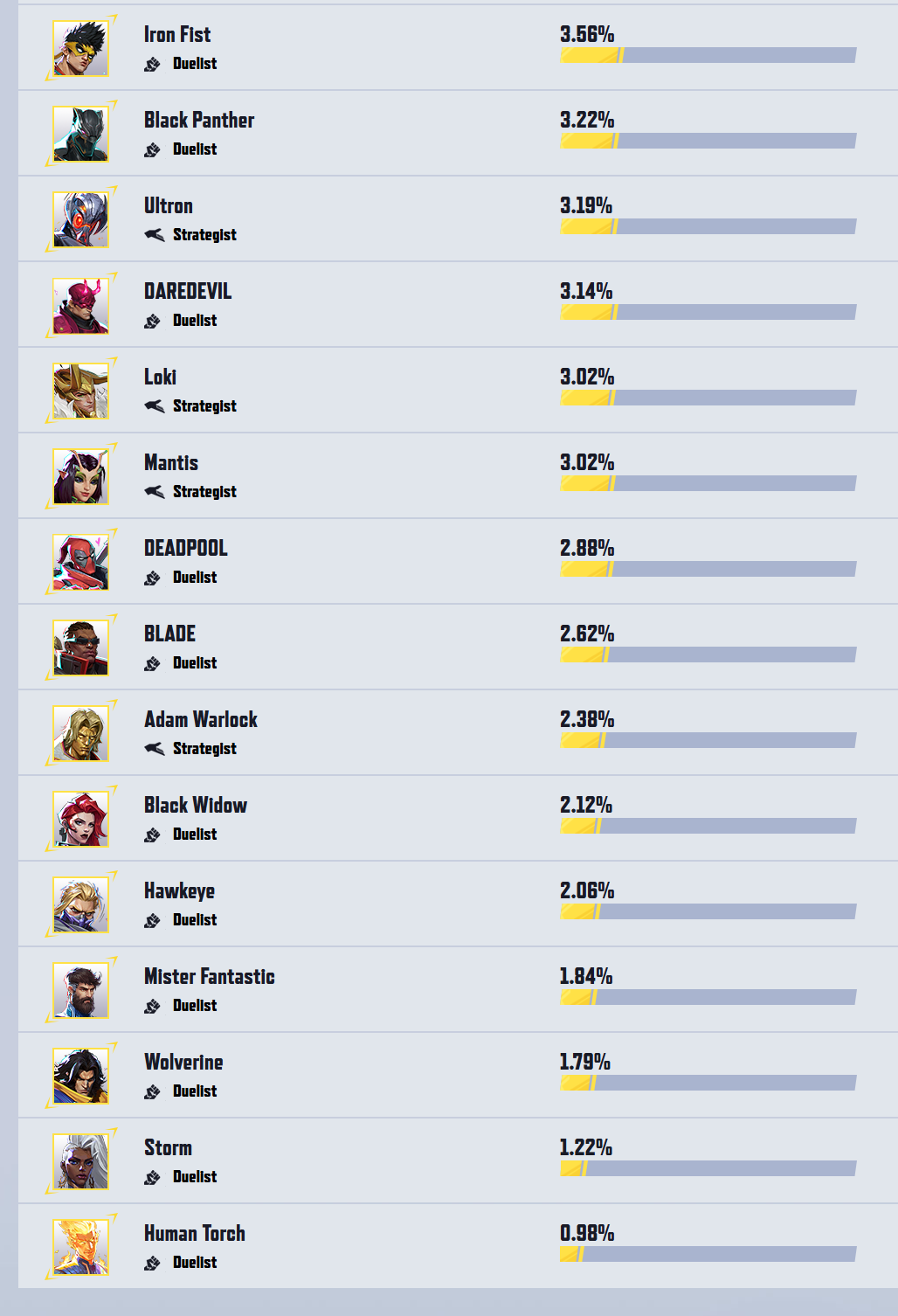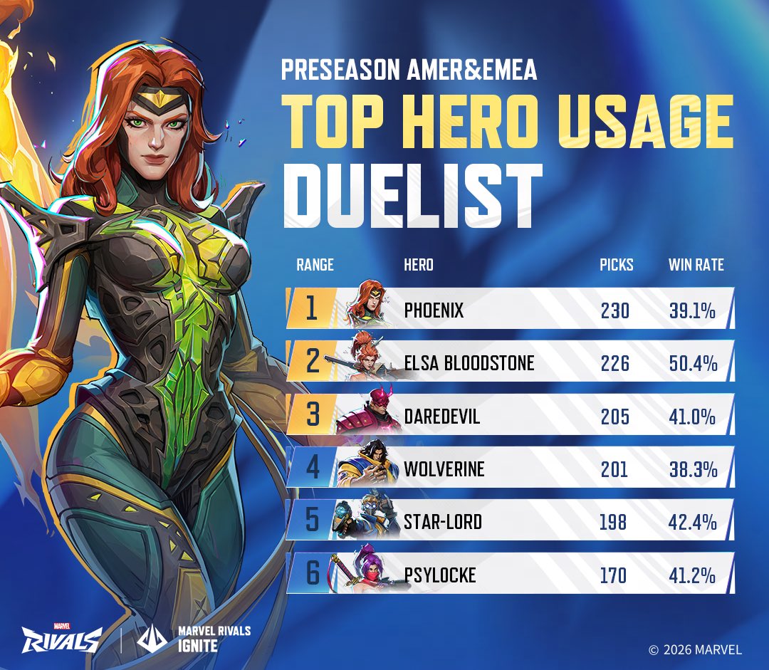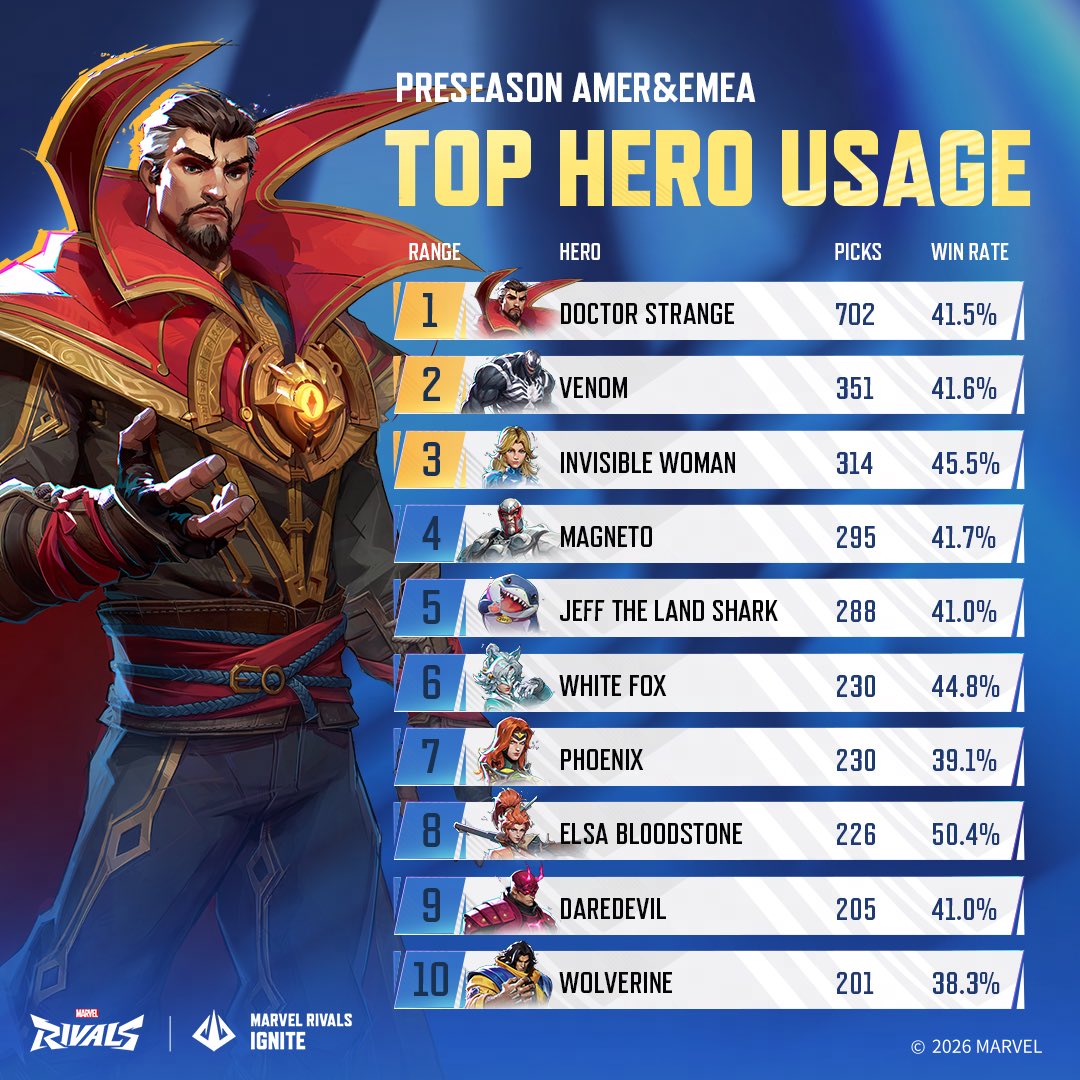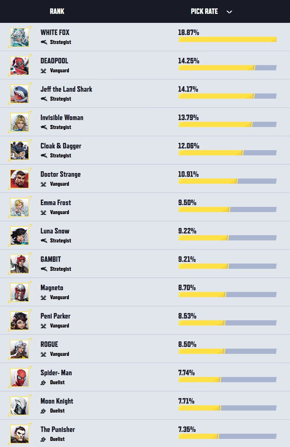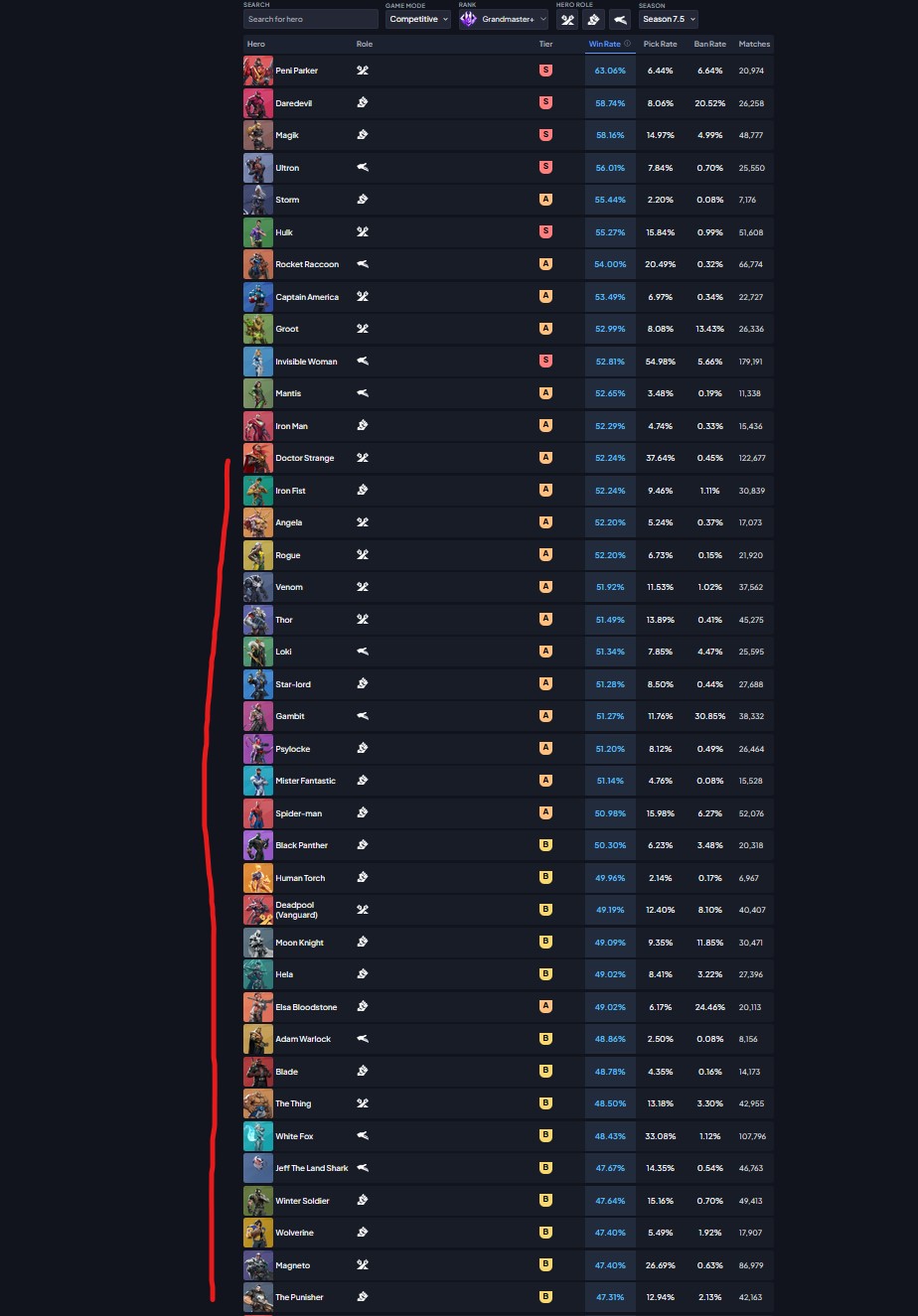>>564375381If we’re talking about how the characters translate into the game. Wolverine is the 2nd least popular x-men, only above storm. His pick rate is horrible.https://www.marvelrivals.com/m/heroes_data/I bet cyclops will rival mag in popularity. You’re thinking about this all wrong.