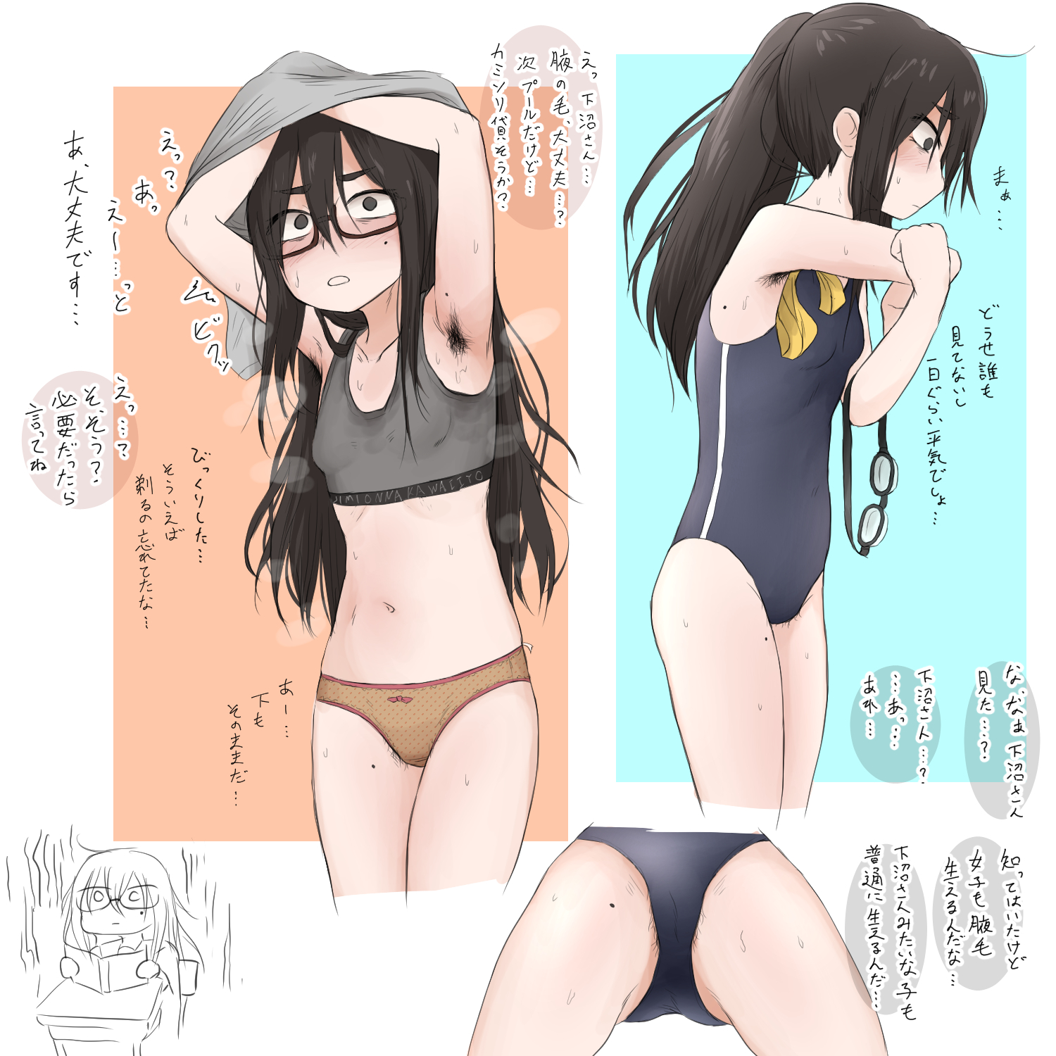 >>564386712Pit hair, pubes, megane and slightly chubby.