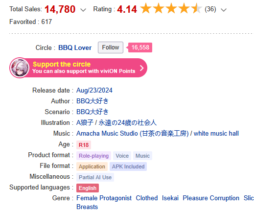 >>564458340He tagged one of his previous games as "partial ai use" but stopped doing that, so I assume he saw backlash and is now trying to conceal it on the dlsite pages.