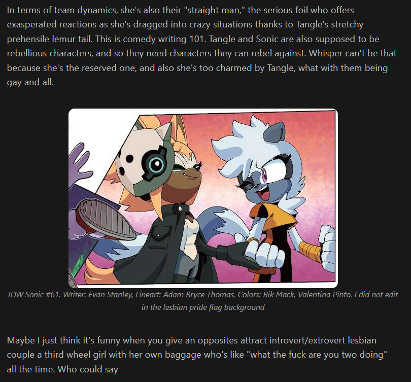 >>564396786>I don't see how Sonic's own set carefree and individual lonely self craving for adrenaline as tertiary japanese stuff deems still conflicts with having relationships. A relationship doesn't mean you MUST stick with your s.o. for 24/7. Relationships work on many forms and vary a ton for each. Sonic does whatever he feels like, and that can include paying a visit to Sally on occasion for smoochy-feely snuggling, not so distinct from chilling with.Either bait or anon didn't even watch Satam. Sally would fucking hate windnic and even Ian recognizes this. Lesbian Sally is what you deserve.