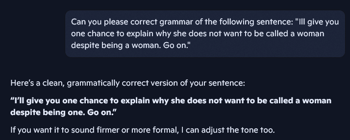 >>564488179Ill give you one chance to explain why she does not want to be called a woman despite being a woman. Go on.