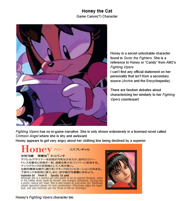 >>564441797>>564441419>■BLAZE (Blaze)■>She manipulates and protects the ‘Sol Emeralds’ (tentative name - items that are counterparts to the Chaos Emeralds). In an alternate world, she takes on the combined roles of Sonic and Knuckles. Usually, she is calm and composed, but it feels like she suppresses her hidden emotions with her rationality. When she burns with anger and her restraint is broken, she becomes quite terrifying.>She is a Tsundere type. She is extremely shy and tends to create a barrier between herself and others at first.>(However, once that barrier is overcome, she becomes excessively intimate)>Normally, she wears a cloak. It serves as a symbol of self-restraint, reminding her not to recklessly use her fire-controlling abilities, which caused her to be bullied in her childhood. However, when something happens, she throws off her cloak and reveals a surprisingly active side.>Underneath the cloak, she hides a costume reminiscent of the Takarazuka Revue! Apparently, she is self-conscious about her lack of a chest... (She becomes extremely angry when this is pointed out).>14 years old.>She is extremely shy and tends to create a barrier between herself and others at first. (However, once that barrier is overcome, she becomes excessively intimate)So Blaze has a shy and awkward exterior but is fiery deep down her while Honey fiery on the outside but is really shy and awkward deep down
