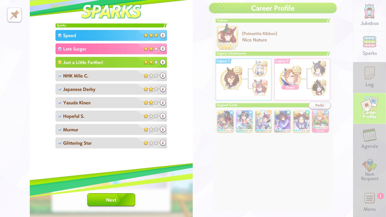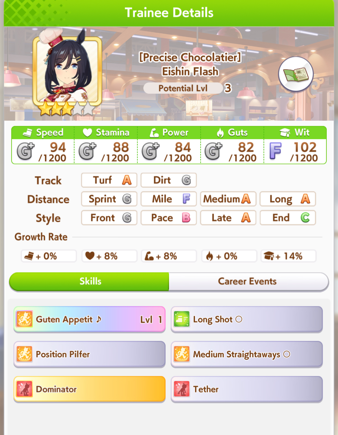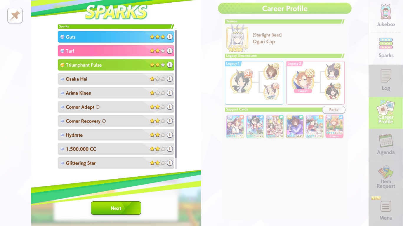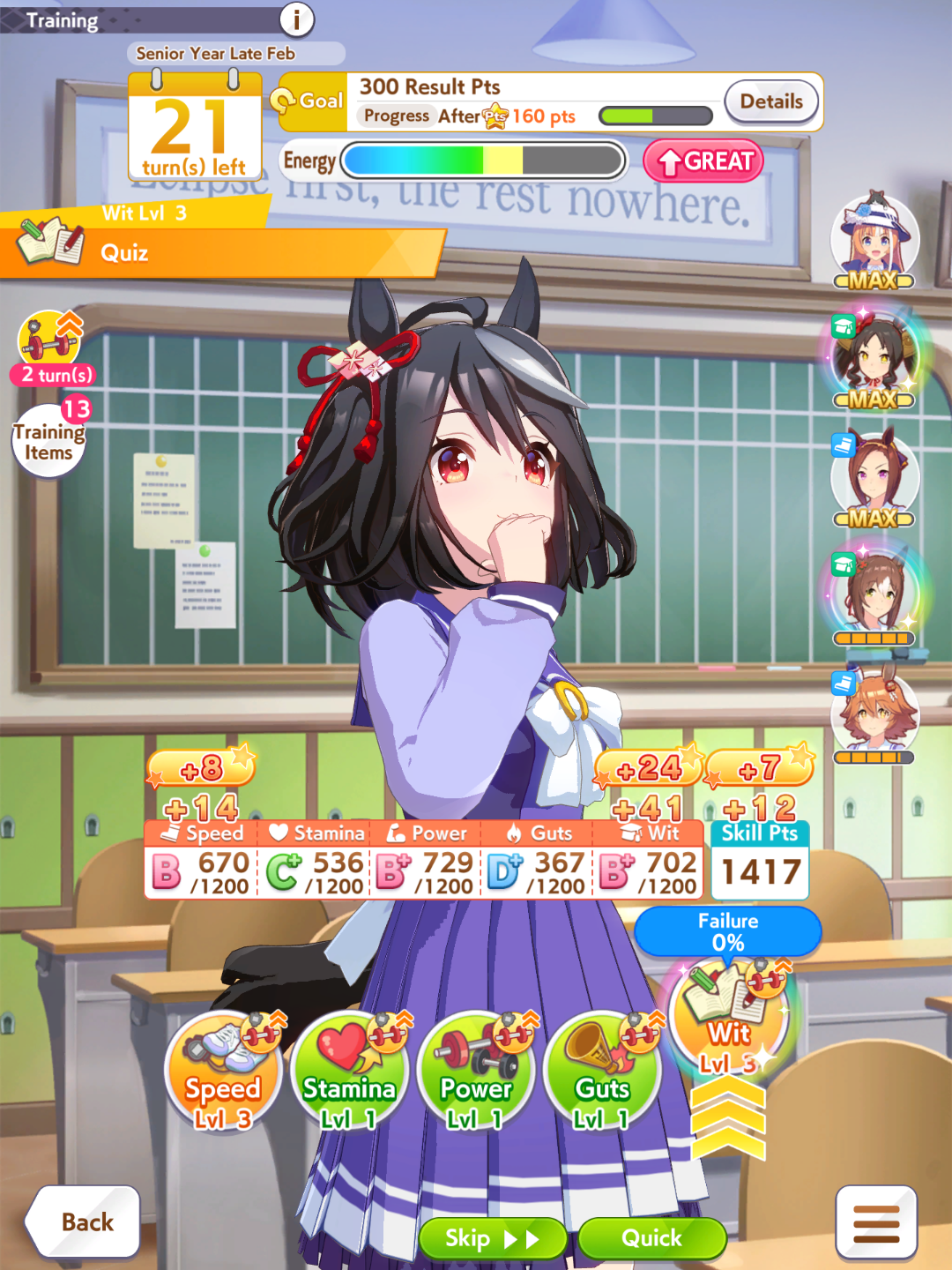 >>564418079>>564418684I still don't know the secret into getting the 4th stat to reach 800+... I could get speed+power+wit to cap consistently whatever but getting that 4th stat stam/guts to 800+ is a matter of just getting luckshit with scrolls in the shop to me