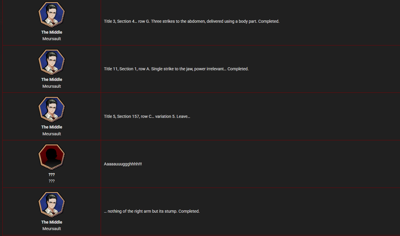 >>564440631Personally, I'm a big fan of their seemingly random punishments. You could get hit 4 times in the torso randomly with a body part, hit in the jaw with varying levels of strength, or having your arm ripped off.