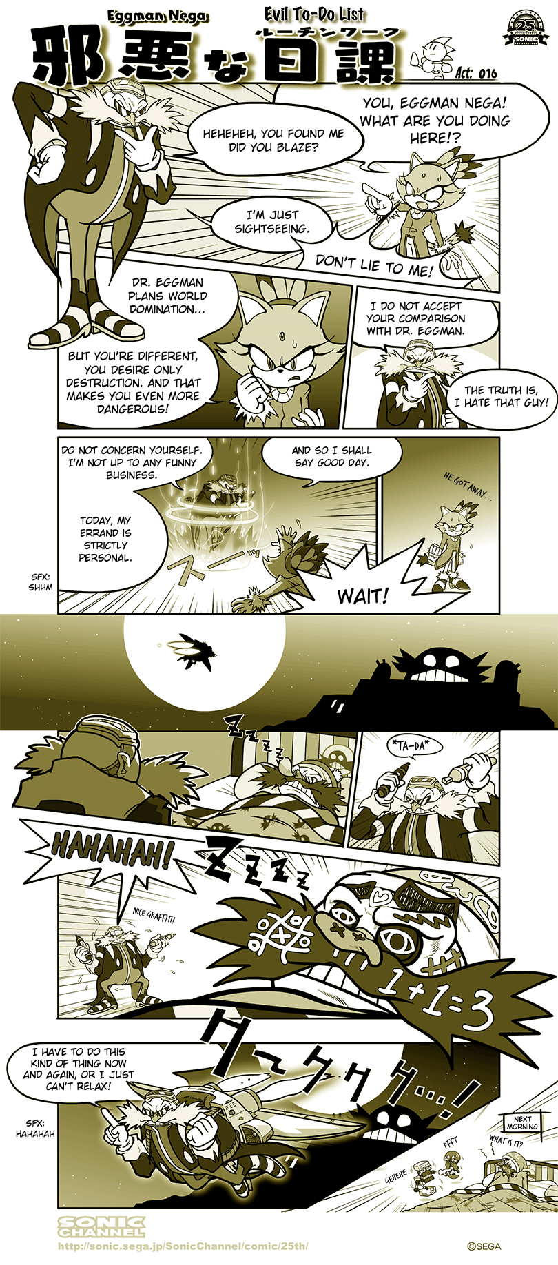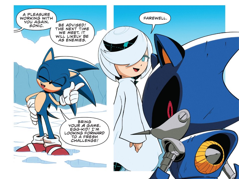 >>564447474They've stuck with the future origin everything since Rivals. Which is ironic since he's also never been associated with Silver outside the Rivals games and is only presented as Blaze's Eggman.>This is the 16th installment of the short comic series, featuring Eggman Nega! A mad scientist with terrifying scientific power who playfully seeks to bring destruction to the world...! He is a distant descendant of Dr. Eggman and a time traveler from the future.>Eggman Nega came from the future to change the negative history of his ancestor, Dr. Eggman, who was plagued by failures. He believed that all the unfortunate realities surrounding him were Dr. Eggman's fault... His attempt to alter history was so disruptive to the world that it was thwarted by Sonic and his friends, but he still seems to have many thoughts about Dr. Eggman. ...Yet, Eggman Nega is also characterized by his ruthless and unscrupulous nature, readily joining forces with Dr. Eggman to achieve his own ambitions. He's quite a villain to be wary of!>This comic is a sketch depicting Eggman Negga's unexpected daily routine. Only Eggman Nega could sneak into Dr. Eggman's heavily guarded base, protected by a powerful defense system, without leaving a trace and pull off his pranks. But Eggman Negga...! Isn't what he's doing a little too childish...?