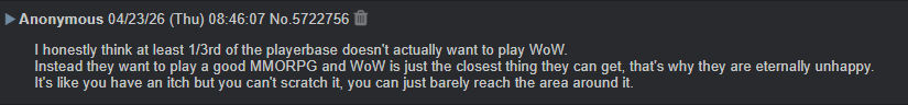 >>564488849This is funny, because 90% of my guild seem to love it.I wonder how disconnected wow "content creators" and ecelebs are from the general playerbase.Probably just as much as Blizzard themselves.