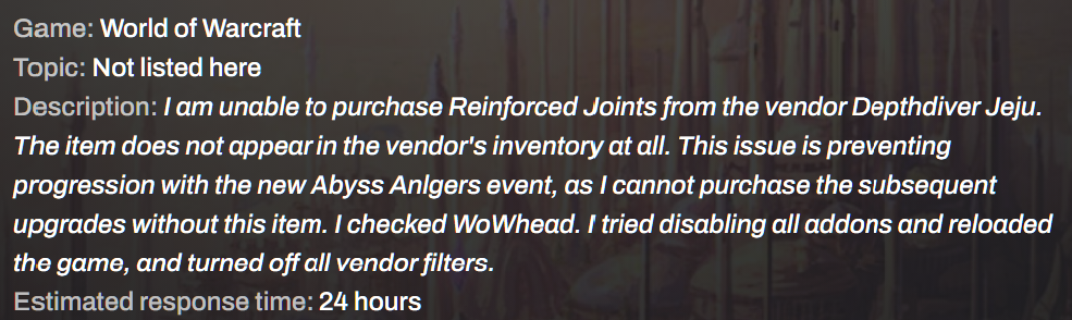 Customer support>Useful Linkshttps://www.wowhead.com/https://www.icy-veins.com/wow/https://warcraft.wiki.gg/wiki/Warcraft_Wikihttps://www.wow-petopia.com/index.phphttps://mythiccodex.me/https://housing.wowdb.com/>/wowg/ guilds(cross-realm and cross-faction)<GLOBOFOMO> --NA--<Nerub Silkweaving Forum> --EU--For cross-realm and cross-faction invites search for the community with the same name as the guild and drop a message!Chromie Time: >>564447003
