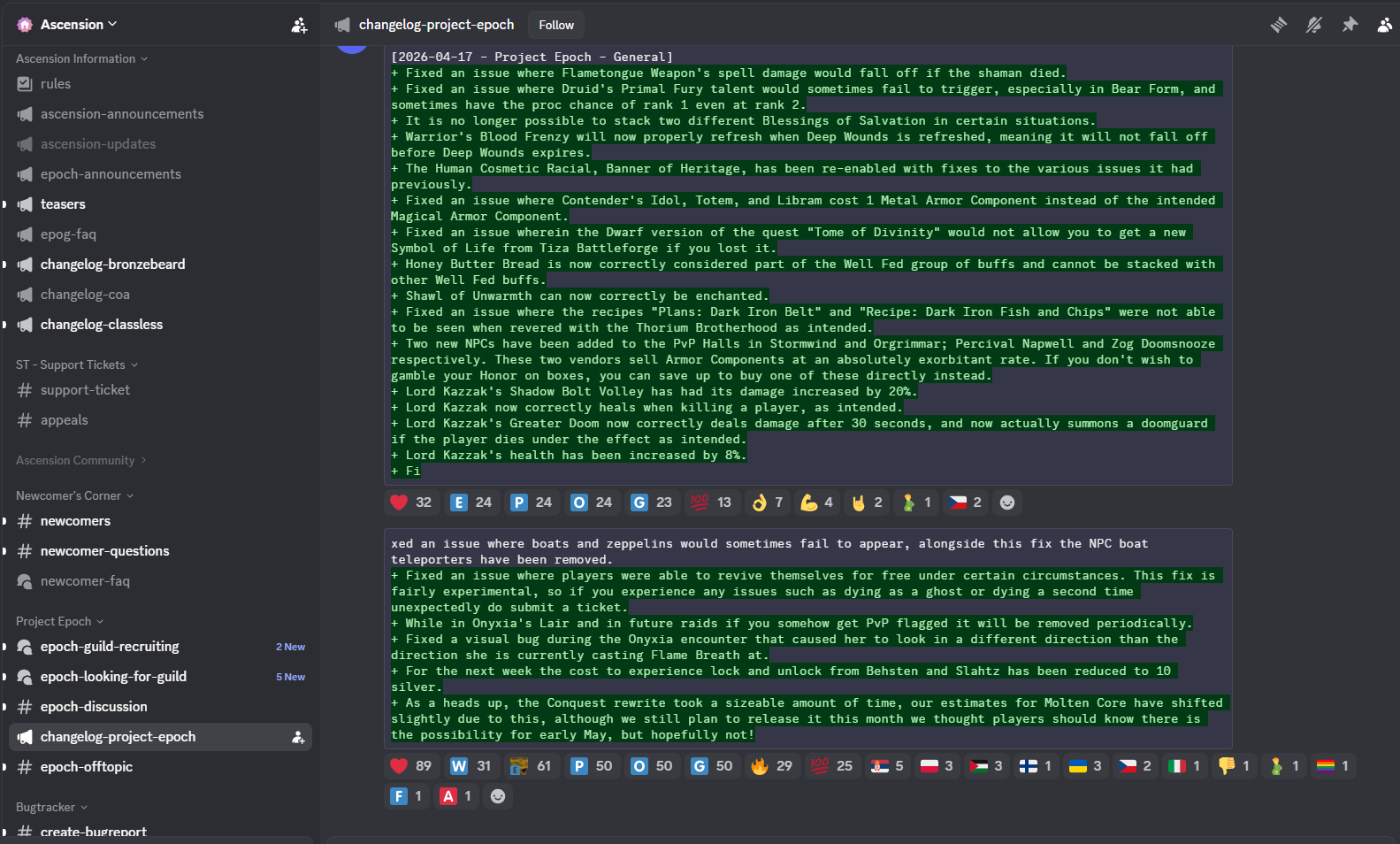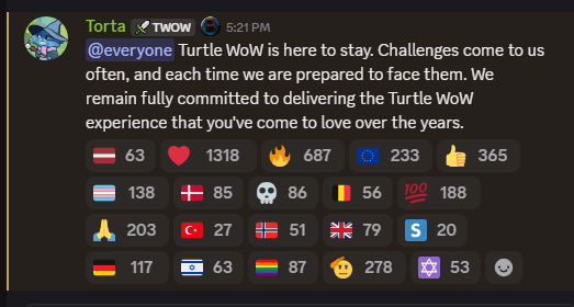 >>564535223most of them got a c&d and quit because Turtle got sued, but a couple are still working on it as basically volunteersthey can't even do announcements or anything, they just announced Onyxia's Lair release on the patch notes.same with MC plans, it's being communicated through patch notes.WHICH ARE AT THE BOTTOM OF THE DISCORD, EVERY OTHER SERVER'S PATCH NOTES ARE AT THE TOP