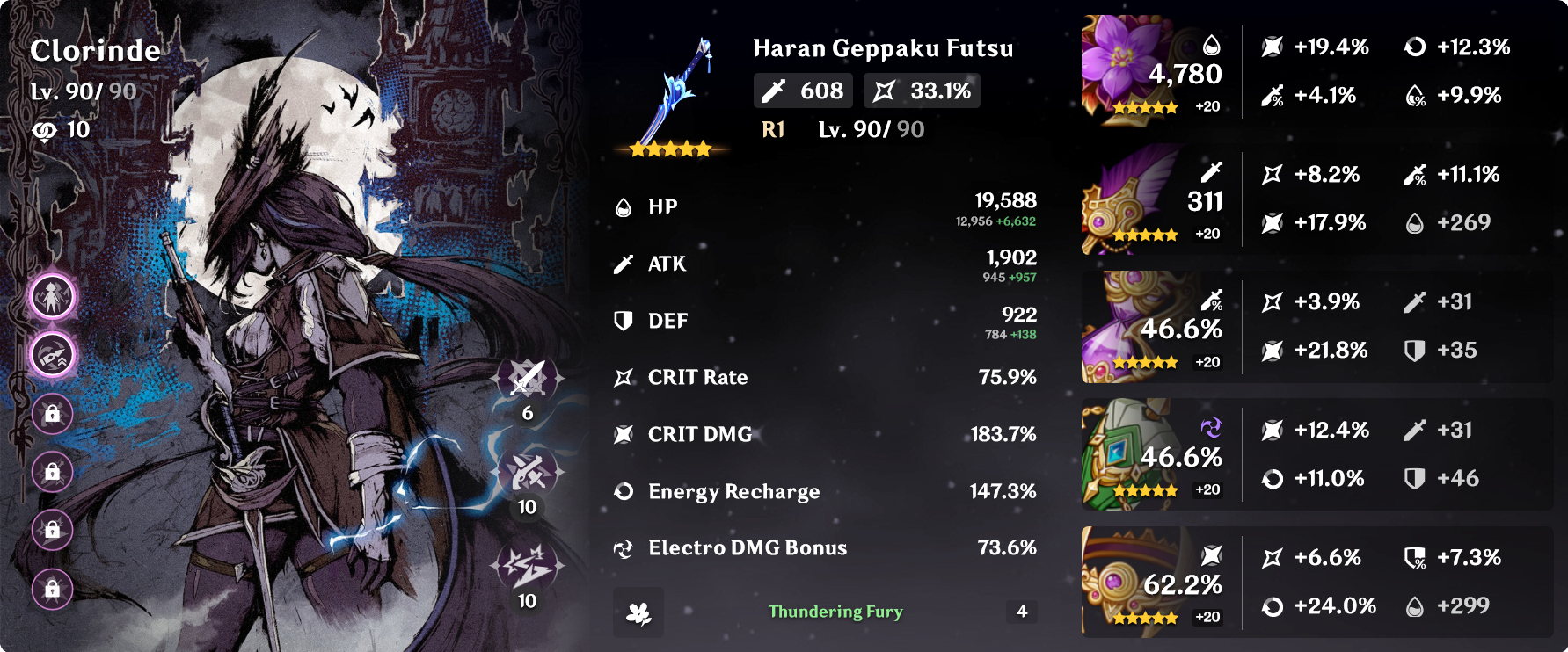 >>564543368I had a whole thing written up but the comment was too long so first I'll ask do you have low ping and are you interested in playing a more complex rotation? Aggravate has several small optimizations to squeeze out several thousand more DPS. It's also a very tight rotation which requires clean execution otherwise the rotation starts to extend and you bleed DPS because you're losing the main advantage it has.>>564543296>her artifacts are scuffed as fuck, though to be fair so are varesa's>the mines have not been kind to electro carries on my accountFor full transparency my Clorinde has like 50% more crit damage and my Fishl is pretty good so you should not expect anywhere near 150k. Having c2 at least makes it easier to keep the rotations consistent since you can just facetank a lot of stuff.
