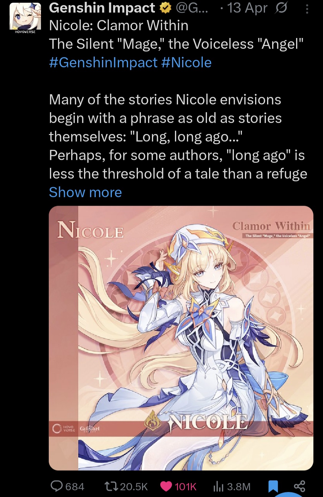 Previous: >>564510449 >Behind the Scenes of Genshin Impact "To Snezhnaya and the Future" airs on April 24 at 08:00 (UTC-4)https://www.twitch.tv/genshinimpactofficial (EN)https://youtu.be/_f7EJnxSR3U [Embed] (JP)>Character Trailer - "Linnea: Precise Answers, Curious Wonders!"https://youtu.be/G3VvCIa-jB0 [Embed] (EN)https://youtu.be/L86-DeBY2LM [Embed] (JP)>Character Teaser — "Linnea: Companion on a Rainy Night"https://youtu.be/6YiuyqftA8U [Embed] (EN)https://youtu.be/Ojd3Ln6_YEU [Embed] (JP)>Version "Luna VI" "Augured Homecoming" Trailerhttps://youtu.be/mVWLSzkpGzA [Embed] (EN)https://youtu.be/G6n5Zc3U0Ls [Embed] (JP)>Current character banner: Linnea, Chasca, Illuga, Aino, Noelle>Current weapon banner: Golden Frostbound Oath (Bow), Astral Vulture's Crimson Plumage (Bow)https://hoyolab.com/article/44512635>Daily check-in rewards (permanent)https://webstatic-sea.mihoyo.com/ys/event/signin-sea/index.html?act_id=e202102251931481&lang=en-us>Redeemable Codes with Primogems (all regions): https://genshin.mihoyo.com/en/giftGENSHINGIFTFairyGirlLinnea8BHA0KFRG94KPSCA8NL4ZSPD>Useful Links (Wiki, Simulators, Maps, Character Builds, /gig/ friendlist, Third-Party Tools, etc.)https://rentry.org/giglinks/gig/ OP pastebin (use this if making new thread):https://pastebin.com/ca0zseQ9