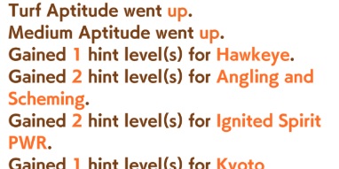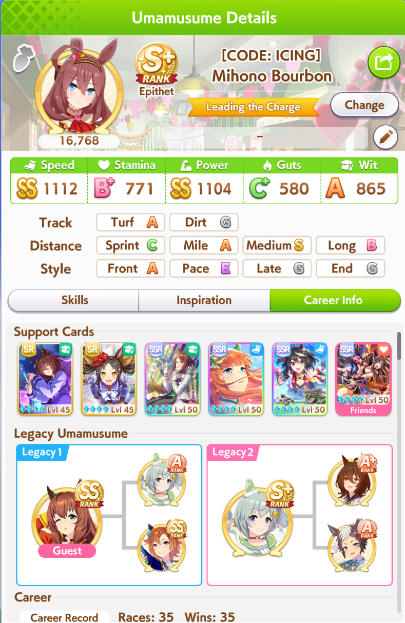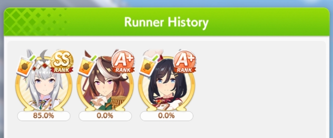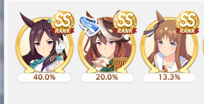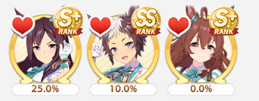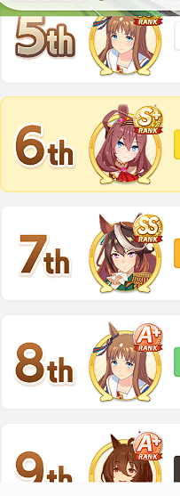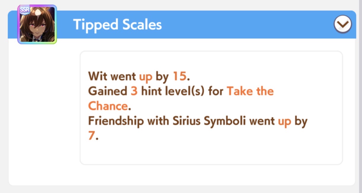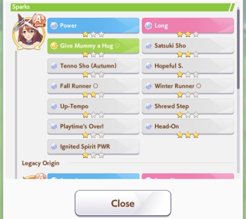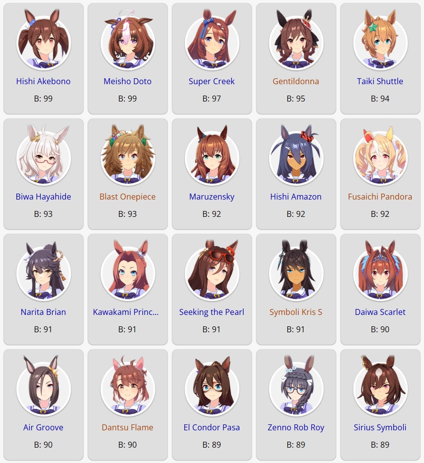 >>564554119This is a BiwaThere are many like her, but this one is mine. You may have the purple version. For the sake of this explanation, both are functionally identical.She has some distance aptitudes. Medium and Long are at A by themselves. You can push them even higher to S by getting lucky with an inspiration, which we will discuss in a moment, but A is good for now.Mile is at C. This is not good enough. When we start a run, we choose legacies, right?Those legacies have three main sparks. The blue one gives stats, the green one gives skill, but the pink one gives aptitude. At the start of a run, if your legacies have either 1-3 stars in pink mile sparks, your base aptitude for mile will increase to B. These sparks can be on either the main parent or grandparents, and since we’re training for a Medium CM, you want these on grandparents to have the highest chance of hitting Medium S. 4-6 mile sparks among your legacies will increase your base aptitude all the way to A. The rest of your pink sparks should be Medium for now.When you visit the three goddess statues in April of Classic and Junior year, you have a chance to get boosts from your legacies. These are further stat increases if you hit a blue spark, further distance aptitudes increases if you hit a pink spark (potentially increasing your aptitude to S), and skill hints/stats if you hit green or white sparks. The chance to hit these are random. You can increase these chances by selecting legacies that won a lot of races, in particular ones that have won prestigious sets of races like the Triple Crown. This increase in probability is known as affinity. A parent with a lot of affinity and high star levels in their sparks is very desirable, as you have a high chance of getting good inspirations.