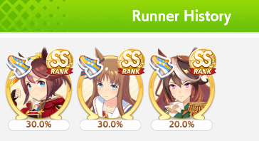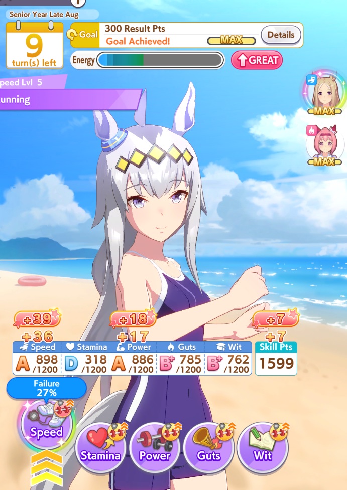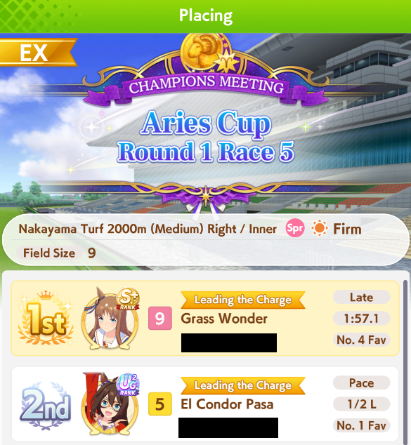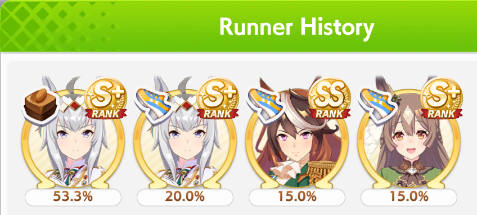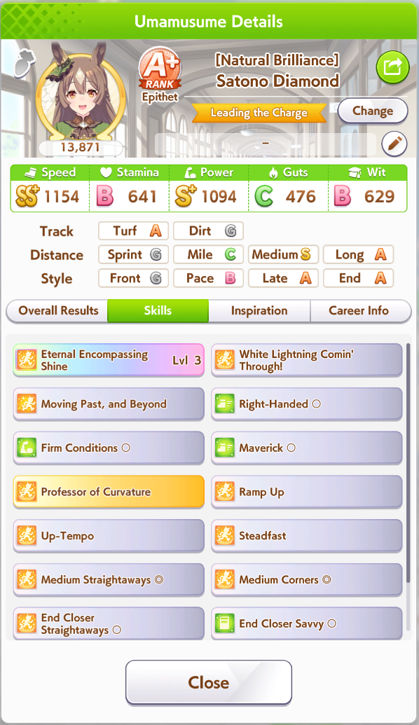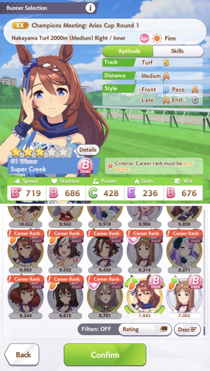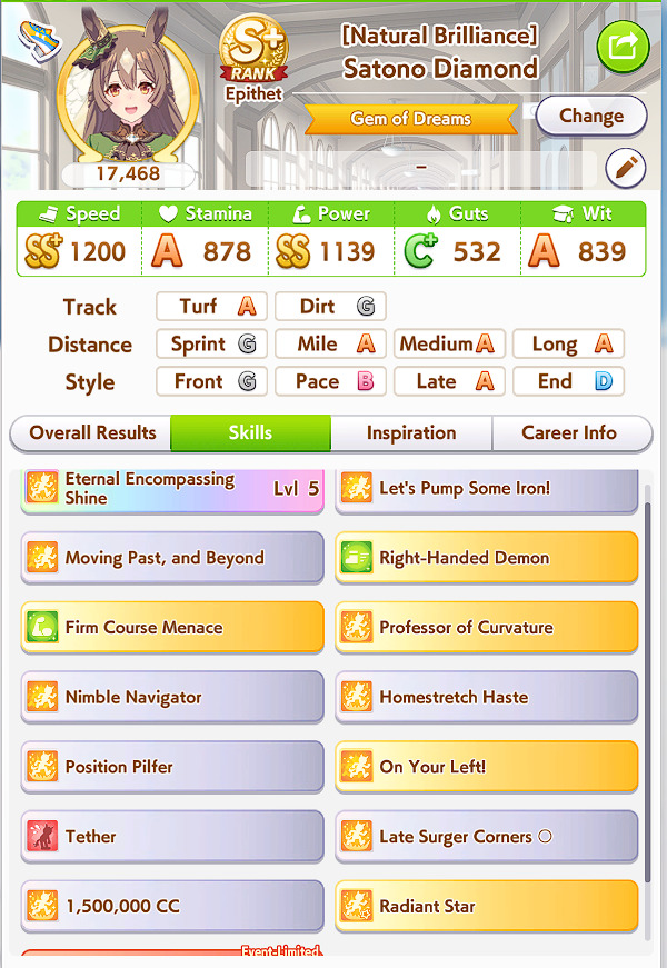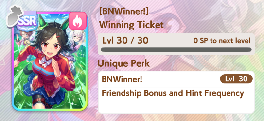 >>564554119This is a BiwaThere are many like her, but this one is mine. You may have the purple version. For the sake of this explanation, both are functionally identical.She has some distance aptitudes. Medium and Long are at A by themselves. You can push them even higher to S by getting lucky with an inspiration, which we will discuss in a moment, but A is good for now.Mile is at C. This is not good enough. When we start a run, we choose legacies, right?Those legacies have three main sparks. The blue one gives stats, the green one gives skill, but the pink one gives aptitude. At the start of a run, if your legacies have either 1-3 stars in pink mile sparks, your base aptitude for mile will increase to B. These sparks can be on either the main parent or grandparents, and since we’re training for a Medium CM, you want these on grandparents to have the highest chance of hitting Medium S. 4-6 mile sparks among your legacies will increase your base aptitude all the way to A. The rest of your pink sparks should be Medium for now.When you visit the three goddess statues in April of Classic and Junior year, you have a chance to get boosts from your legacies. These are further stat increases if you hit a blue spark, further distance aptitudes increases if you hit a pink spark (potentially increasing your aptitude to S), and skill hints/stats if you hit green or white sparks. The chance to hit these are random. You can increase these chances by selecting legacies that won a lot of races, in particular ones that have won prestigious sets of races like the Triple Crown. This increase in probability is known as affinity. A parent with a lot of affinity and high star levels in their sparks is very desirable, as you have a high chance of getting good inspirations.