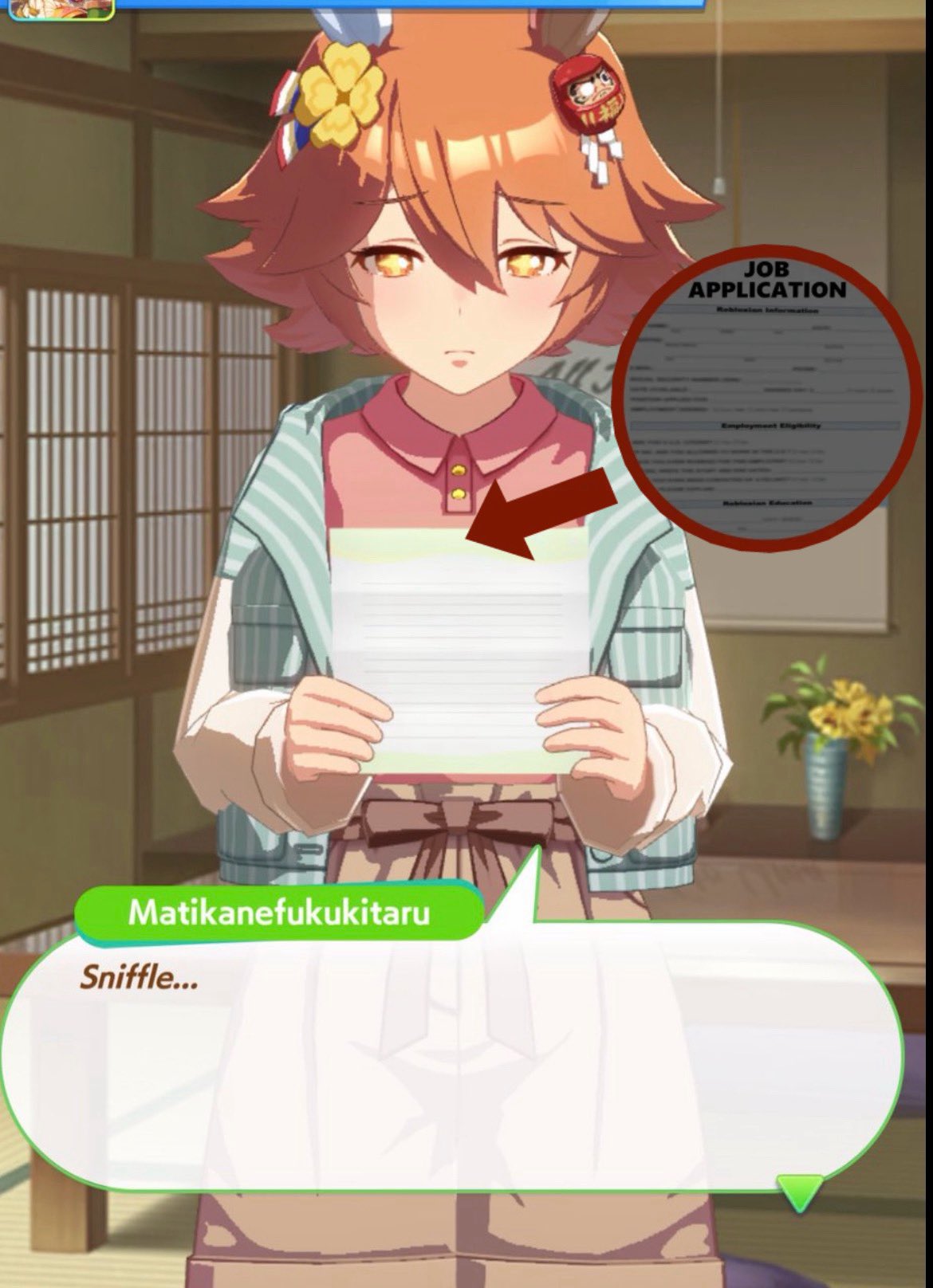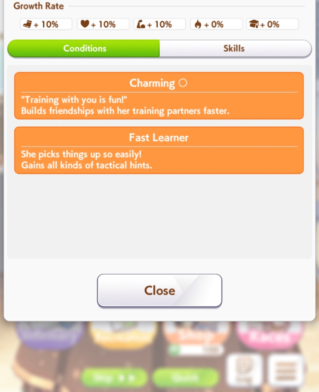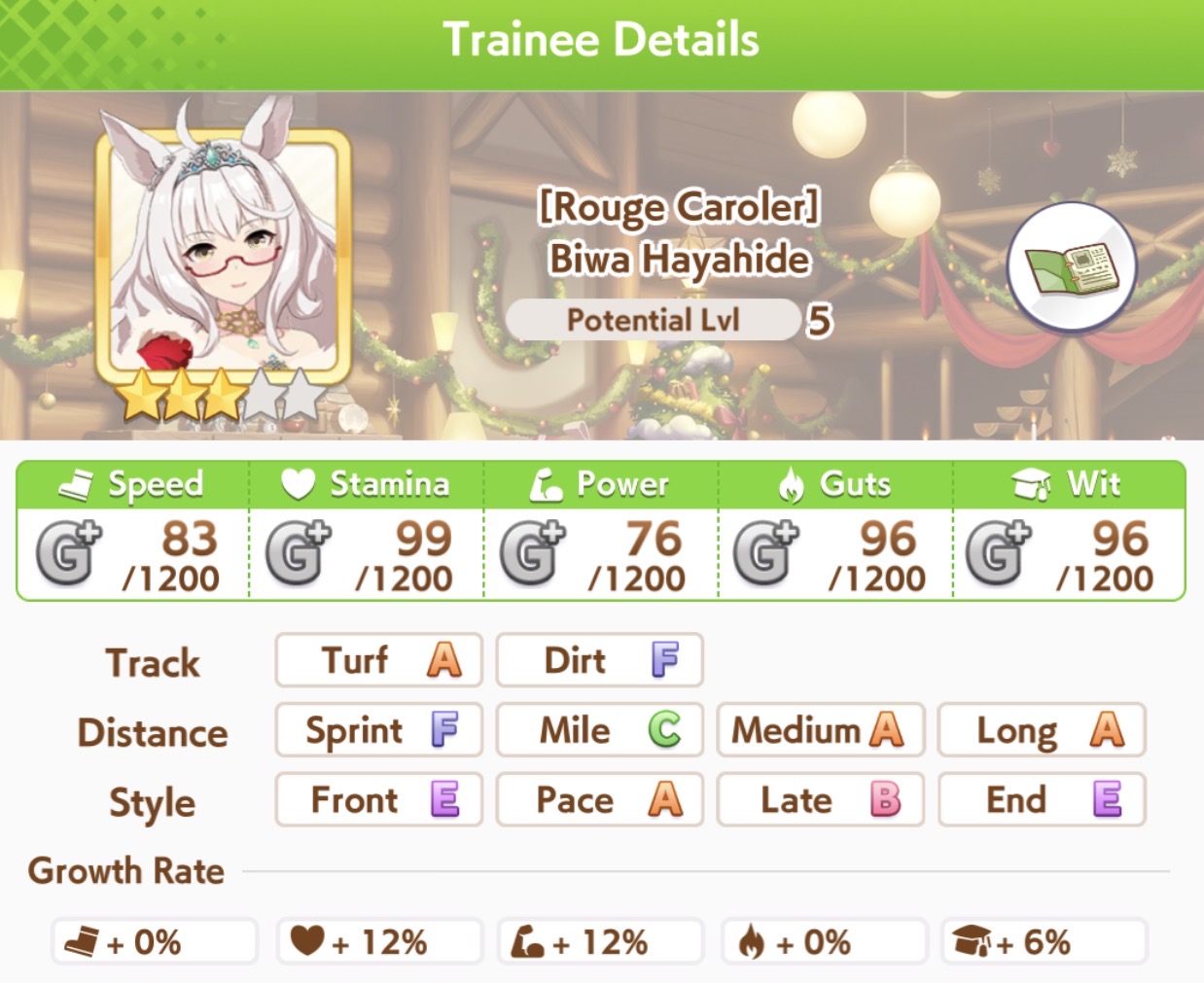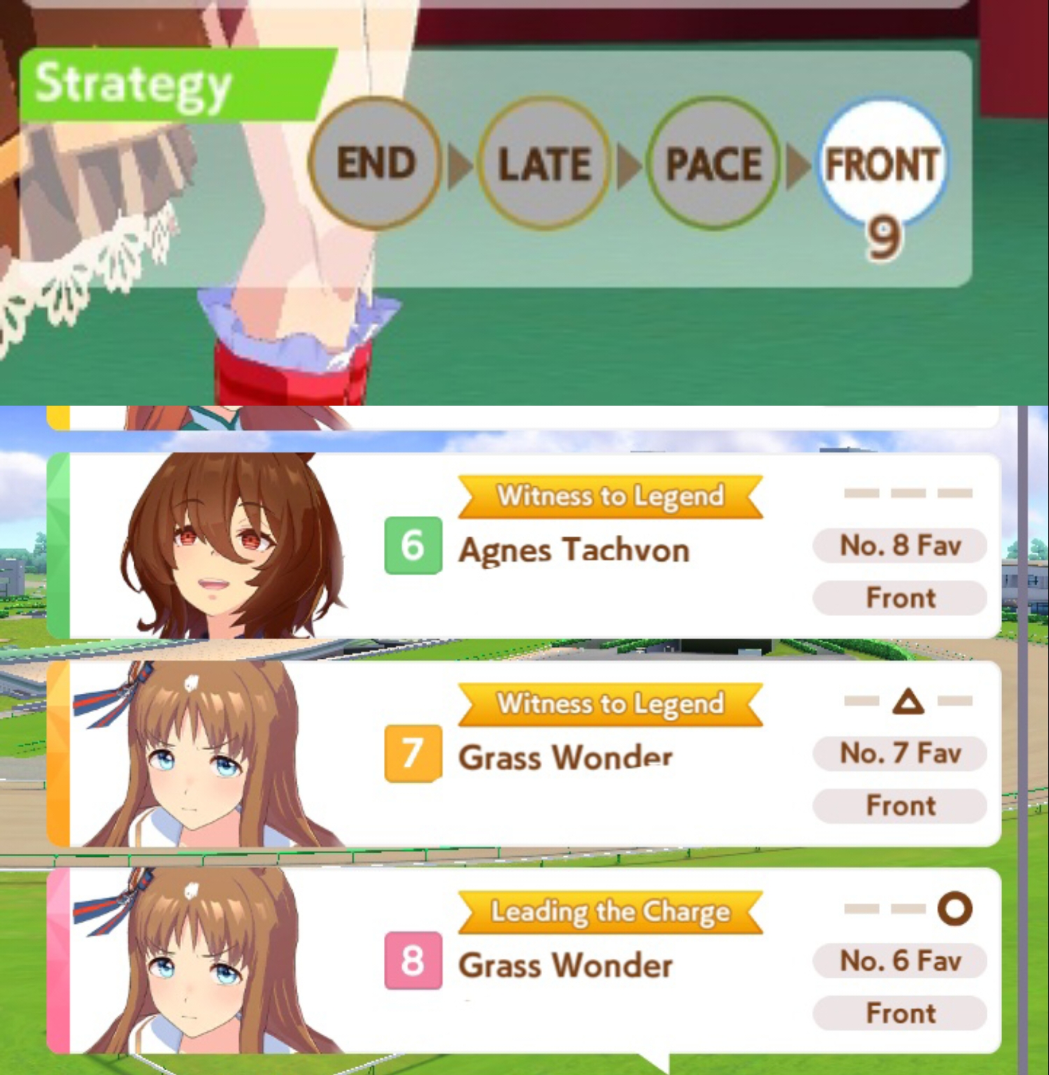 >>564554119This is a BiwaThere are many like her, but this one is mine. You may have the purple version. For the sake of this explanation, both are functionally identical.She has some distance aptitudes. Medium and Long are at A by themselves. You can push them even higher to S by getting lucky with an inspiration, which we will discuss in a moment, but A is good for now.Mile is at C. This is not good enough. When we start a run, we choose legacies, right?Those legacies have three main sparks. The blue one gives stats, the green one gives skill, but the pink one gives aptitude. At the start of a run, if your legacies have either 1-3 stars in pink mile sparks, your base aptitude for mile will increase to B. These sparks can be on either the main parent or grandparents, and since we’re training for a Medium CM, you want these on grandparents to have the highest chance of hitting Medium S. 4-6 mile sparks among your legacies will increase your base aptitude all the way to A. The rest of your pink sparks should be Medium for now.When you visit the three goddess statues in April of Classic and Junior year, you have a chance to get boosts from your legacies. These are further stat increases if you hit a blue spark, further distance aptitudes increases if you hit a pink spark (potentially increasing your aptitude to S), and skill hints/stats if you hit green or white sparks. The chance to hit these are random. You can increase these chances by selecting legacies that won a lot of races, in particular ones that have won prestigious sets of races like the Triple Crown. This increase in probability is known as affinity. A parent with a lot of affinity and high star levels in their sparks is very desirable, as you have a high chance of getting good inspirations.
