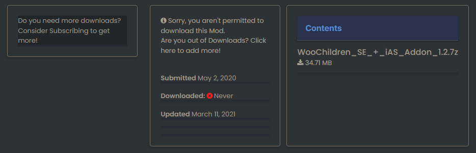 >>564577138You have to go through a humiliation ritual to download mods from that website. It limits you to a few downloads and for some mods you have to install their proprietary software to complete a download. I got what I needed and will never use it again.