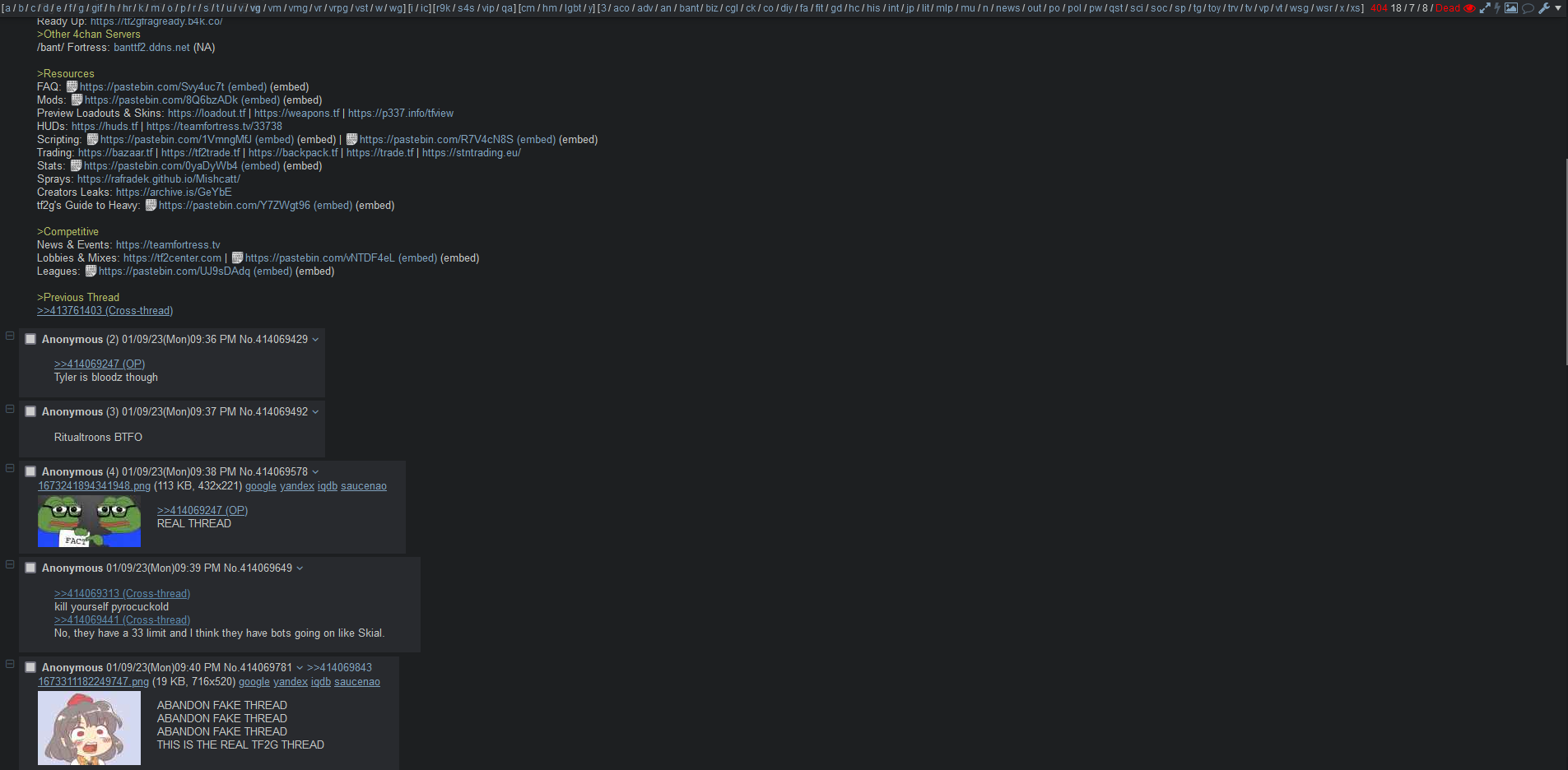 Tomodachi Life Edition>NewsPoker Night remaster released: https://store.steampowered.com/app/3897800/Poker_Night_at_the_Inventory/>Official SitesBlog: https://teamfortress.comWiki: https://wiki.tf>Frag With /tf2g/When: Friday & Saturday Afternoon. Check for posts in the thread or be the one to announce.tf2g's Official Server: 78.46.128.115:27015 (EU)Ready Up: https://tf2gfragready.b4k.dev/>Other 4chan ServersWeeabootique: 198.245.61.57 (NA)Castaway: Castaway.tf (NA/EU/AUS/Asia)Konata: konata.tf (EU)>ResourcesFAQ: https://pastebin.com/Svy4uc7tMods: https://pastebin.com/8Q6bzADkPreview Loadouts & Skins: https://loadout.tf | https://weapons.tf | https://p337.info/tfviewHUDs: https://gamebanana.com/mods/cats/1644 | https://tf2huds.dev/Scripting: https://pastebin.com/1VmngMfJ | https://pastebin.com/R7V4cN8STrading: https://backpack.tf | https://trade.tf | https://stntrading.eu/ | https://tf2trade.tf/Stats: https://pastebin.com/0yaDyWb4Sprays: https://rafradek.github.io/Mishcatt/Community Server Browsers: https://serverbrowser.tf/ | https://thegabenzone.github.io/truequickplay/#/serversCreators Leaks: https://archive.is/GeYbEtf2g's Guide to Heavy: https://pastebin.com/Y7ZWgt96>Competitive News & Events: https://teamfortress.tv Lobbies & Mixes: https://tf2center.com | https://pastebin.com/vNTDF4eLLeagues: https://pastebin.com/UJ9sDAdq>Previous Thread>>564261350
