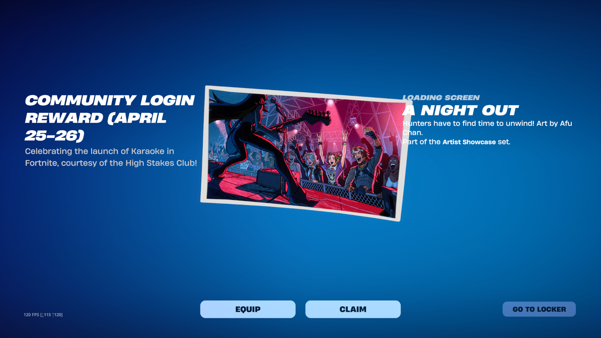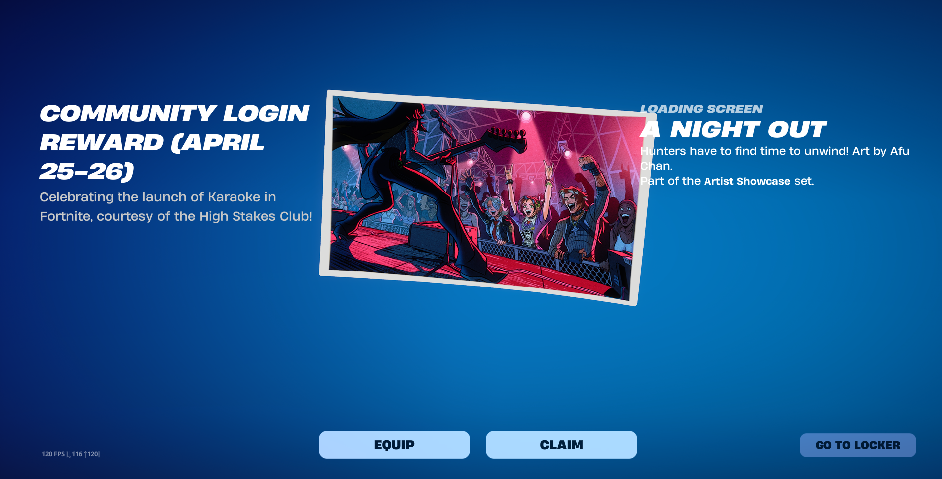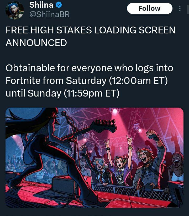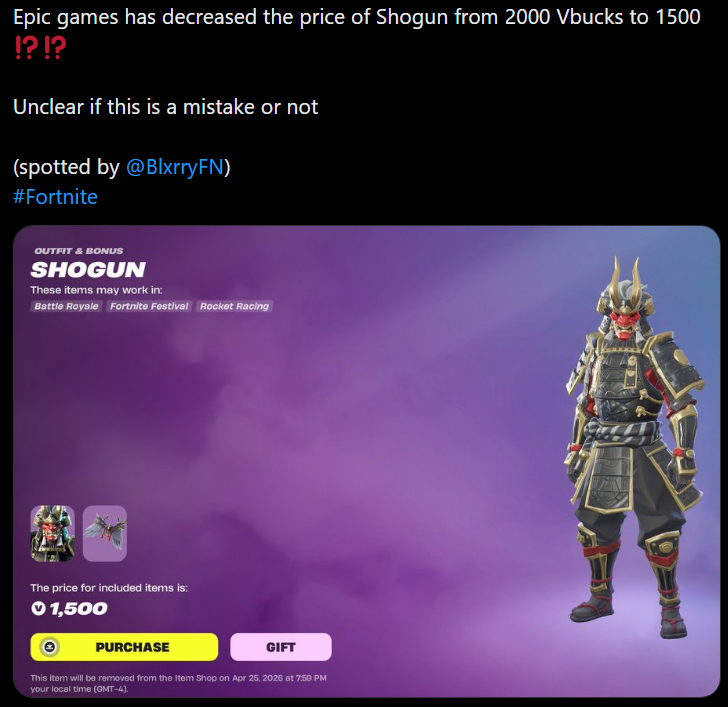 >Login from Saturday, April 25 at 12:00 AM ET to Sunday, April 26 at 11:59 PM ET to receive "A Night Out" Loading Screen >Finish quests in Fortnite & Rocket League for the Havoc Car Body and Dueling Dragons Jackie Skin until April 30th ET>Fortnite Chapter 7 Season 2: Act II Teaserhttps://www.youtube.com/watch?v=PugOvn9DaTs >Fortnite Chapter 7 Season 2: Showdown | Official Launch Trailerhttps://www.youtube.com/watch?v=e4sCLYMSokg >Fortnite Chapter 7 Season 2: Showdown | Cinematic Trailerhttps://www.youtube.com/watch?v=m-c_3degE60>Showdown in the New Fortnite Battle Royale Seasonhttps://www.fortnite.com/news/showdown-in-the-new-fortnite-battle-royale-seasonhttps://showdown.fortnite.com/en-US/>Fortnite Chapter 7 Season 2: Showdown | Cinematic Recap Trailerhttps://www.youtube.com/watch?v=KIlnglVOuG0 >Quests, stats, shophttps://fortnite.gghttps://fortnite.gg/statshttps://fortnite.gg/shophttps://www.fortnite.com/item-shop>Season XP Leveling Pacehttps://www.fortnitexp.net/>Mission Alerts for StWhttps://freethevbucks.com/timed-missions/https://fortnitedb.com/>Join the Elites in Fortnite Reload: Elite Strongholdhttps://www.fortnite.com/news/join-the-elites-in-fortnite-reload-elite-stronghold>Laufey’s Distinct Sound Headlines Fortnite Festival Season 14https://www.fortnite.com/news/laufeys-distinct-sound-headlines-fortnite-festival-season-14>Save the World Goes Free-to-Play April 16https://www.fortnite.com/news/fortnite-save-the-world-goes-free-to-play-april-16>Fortnite V-Bucks Price Increasehttps://www.fortnite.com/news/fortnite-v-bucks-price-increase>Master Your True Potential in LEGO® Fortnite Odyssey’s NINJAGO® Updatehttps://www.fortnite.com/news/master-your-true-potential-in-lego-fortnite-odysseys-ninjago-update>Fortnite Crew April 2026 - Sakarahttps://www.fortnite.com/fortnite-crew-subscriptionPrevious:>>564500526
