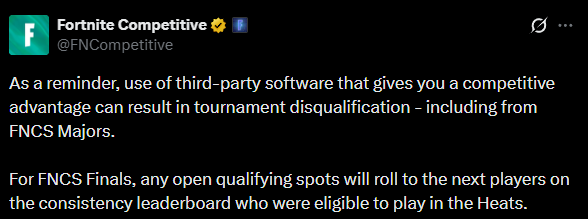 Fortnite posts a reminder after disqualifying multiple players from the upcoming FNCS Finals"Use of third-party software that gives you a competitive advantage can result in tournament disqualification - including from FNCS Majors."The players in question>Josh Eomzo>Acorn Boltz>Golden Ozone>Shadow VergoWhat did they useA third party software that let them know how much storm surge they've taken and done, usually the game tells you how much you have made but it's not an exact number, it also shows your optimal drop point for the storm during the match