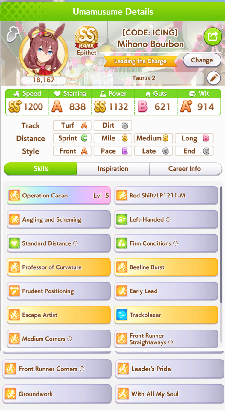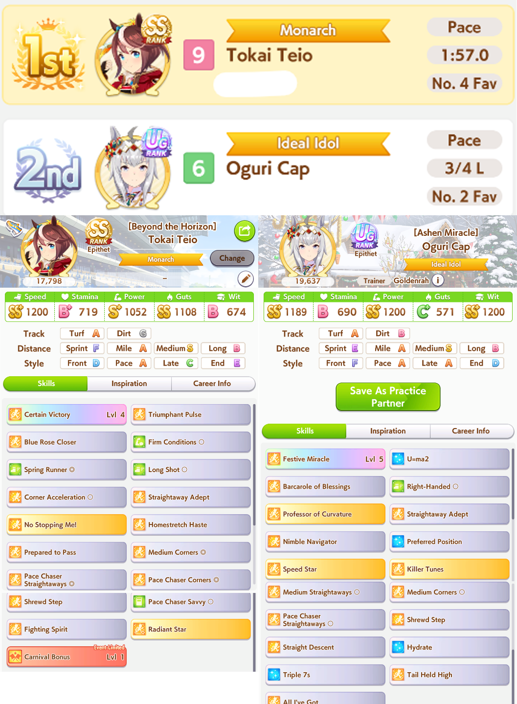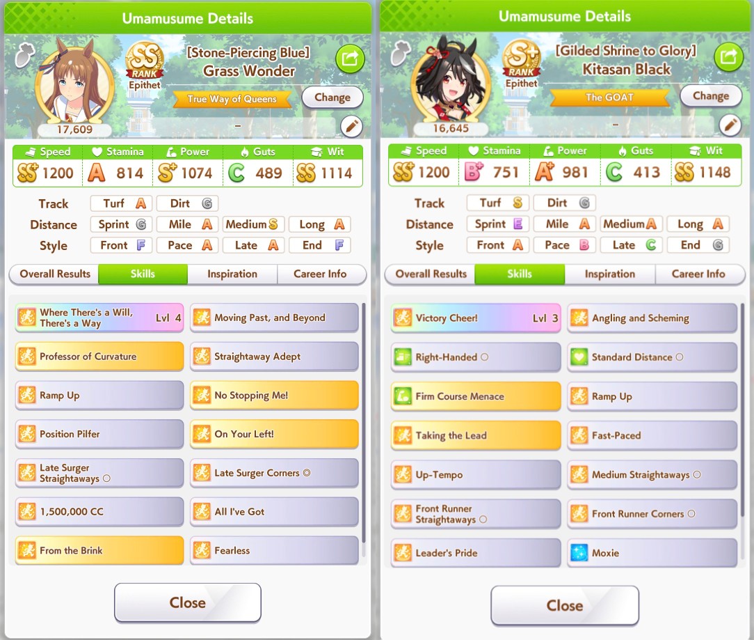 >>564659536the Grass is actually a crackpot triple gold accel ace i made earlier today, she's managed to win twice so far>>564659853this kita has won 4 so far, she and falco (6 wins) are doing better than i expected considering no gw on either of themcropped out skills are THH and radiant
