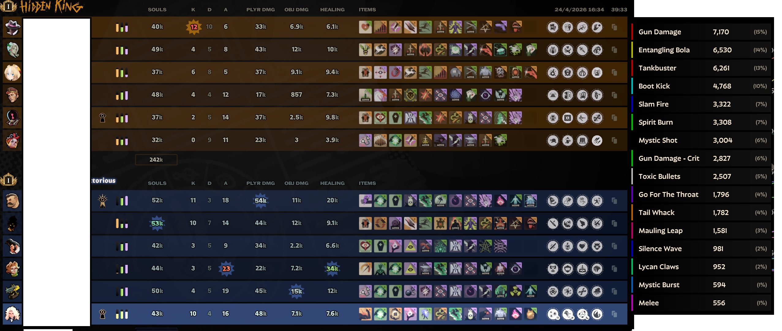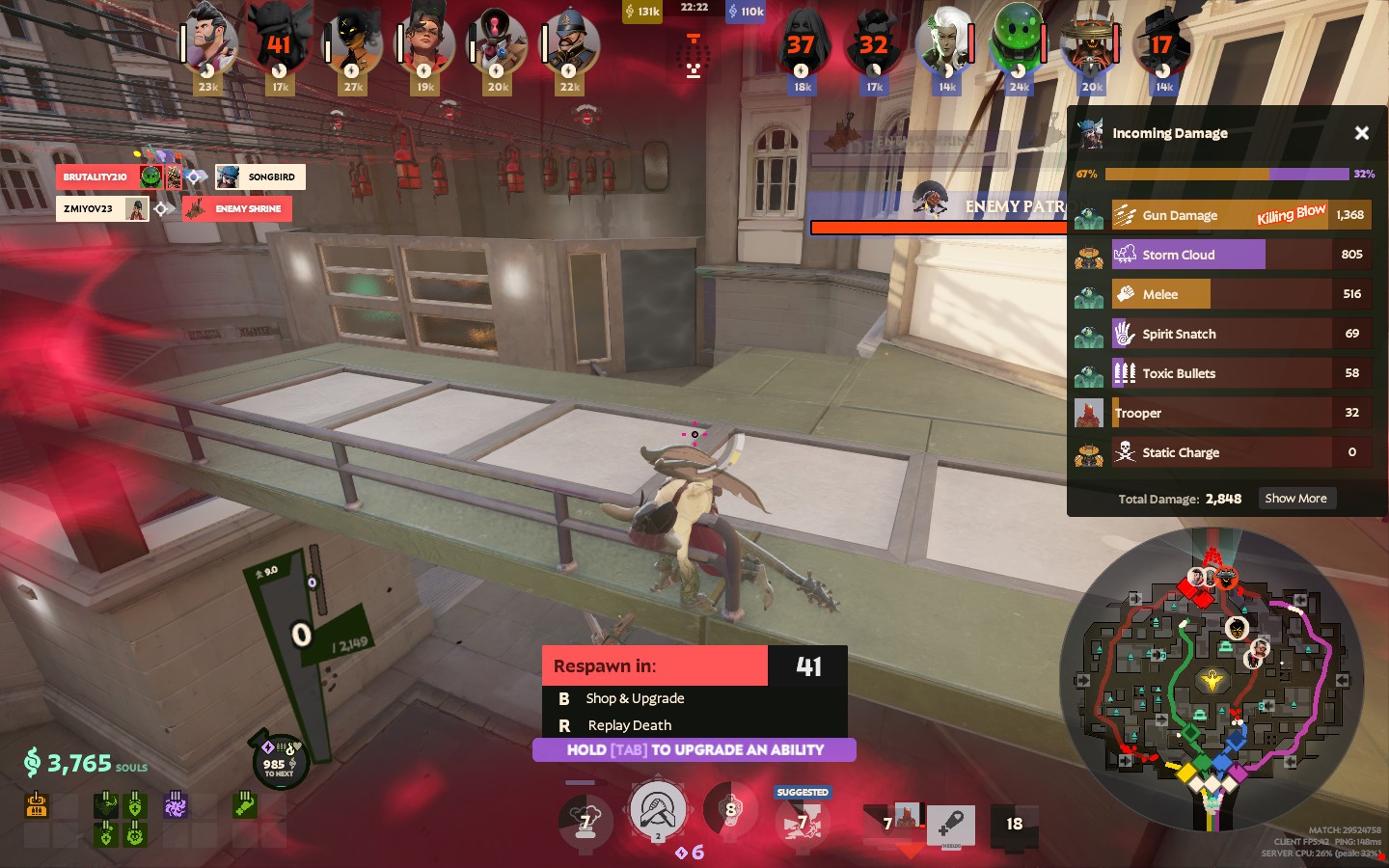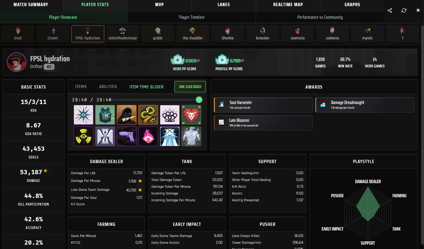 >>564707880>"gun weaker early, spirit strong early"But then that heavily limits design space and now you can't have late game spirit stuff without messing with some complicated stuffThis is the real problem>>564708007When you're losing to gun you're not only being hit by gun damage but also spirit procs and what not because for some reason valve forced spirit scalings on everything gun so the intended counterplay like metal skin and return fire doesn't even do that much.Doesn't help that gun heroes also have amazing abilities so you're still dying to wraith and infernus shit and getting cced by them even if you use stuff like disarming hex.And to boot if they hit you for a microsecond you now need to also use debuff remover just so the infernus doesn't do 2k damage to you just by shooting at you for 0.10 seconds but god forbid if he does it again while it's on cooldown.It's not a "gun should be weaker early" because not every hero can build gun and kill everyone early, it's certain hero kits doing everything.