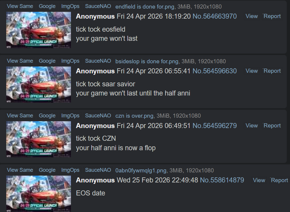Previous: >>564588178>"At the Wake of Spring"https://www.youtube.com/watch?v=MJ7FeHa3bYchttps://www.youtube.com/watch?v=tMFGowIF8eA >Official Websitehttps://endfield.gryphline.com/en-us>Official EN X (News)https://x.com/AKEndfield>DEV Comm (Latest Developer Update)https://endfield.gryphline.com/en-us/news/4494>Zhuang Fangyi PVshttps://www.youtube.com/watch?v=mDYYshBRnak https://www.youtube.com/watch?v=e0N-S1FSc8Y https://www.youtube.com/shorts/uS9QUNZvj1A>Zhuang Fangyi EPhttps://www.youtube.com/watch?v=dDLUMmQqxsI >Chartered Headhunting ScheduleApril 17th to May 22nd --- "Thunder of Renewal", Zhuang Fangyi>SKPORT Daily Sign-inhttps://game.skport.com/endfield/sign-in?header=0&hg_media=skport&hg_link_campaign=tools>Twitch Dropshttps://endfield.gryphline.com/special/third-party-binding?channel=twitch>Reward CodesENDFIELDGIFTENDFIELD4PC>Wikishttps://wiki.skport.com/endfield (Official)https://perlica.moehttps://warfarin.wiki/enhttps://endfield.wiki.gg/>Blueprint Guideshttps://talospioneers.com/en>Stickershttps://drive.google.com/drive/folders/1AJxEo7-IyS_3WbHSVDkbaE9t-yTisIE5https://drive.google.com/drive/folders/1ygy_INxpFqDx5XV_lBVJnrho72zl0joj