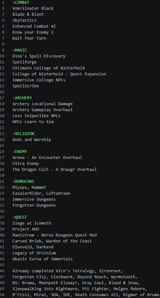 >>564760341>EnemyRogues n RaidersVampire Clans and BloodlinesTrue Unleveled Skyrim>QuestMissives>Dungeons (sort of)Skyrim Realistic Conquering AIO