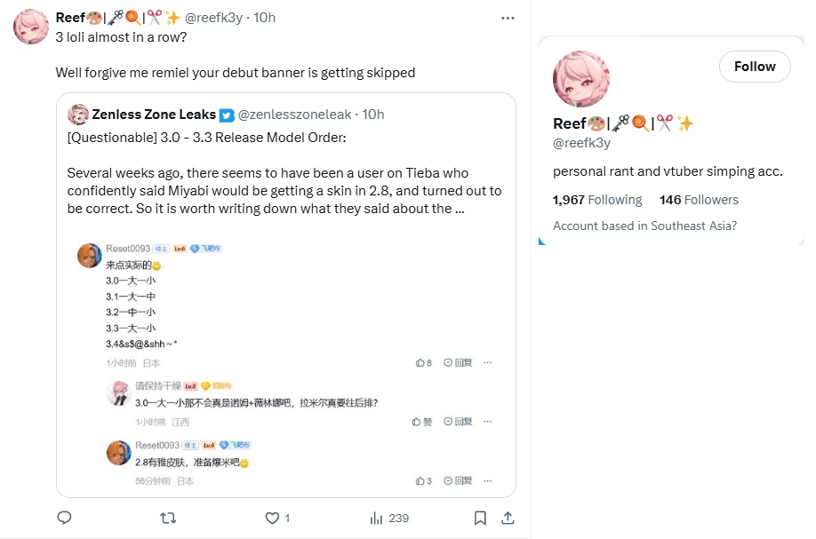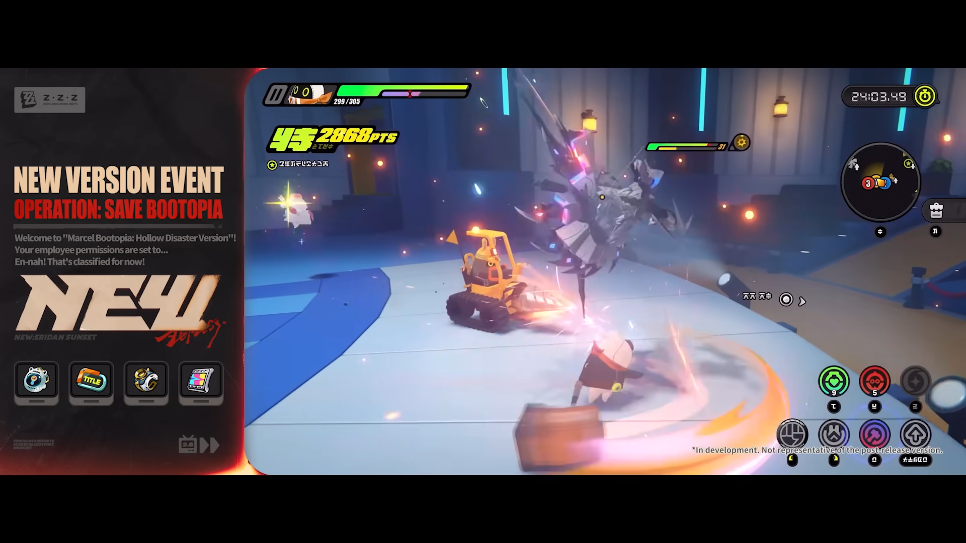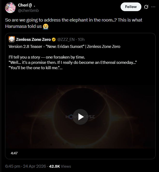 Previous: >>564637210>NewsVersion 2.8 Special Program will begin on April 24 at 19:30 (UTC+8)Agent Record | Starlight - Billyhttps://www.hoyolab.com/article/44378132Agent Record | Promeiahttps://www.hoyolab.com/article/44377604Version 2.7 Special Programhttps://youtu.be/sK_s_MXs89M>Newest Trailer/Teaser/Character demohttps://youtu.be/tN0ibny9Ans (EN)https://youtu.be/25vaOHfSDUY (JP)https://youtu.be/7FbKuJv0e1I (EN)https://youtu.be/rBgqwLdtX-I (JP)https://youtu.be/LSEz6KT026k>Upcoming Events for 2.7https://zenless.hoyoverse.com/en-us/news/163253Chronicle of Simmering Flavors 03/25 - 05/05All-New Program 03/24 - 05/05Special Disaster Control Squad 04/03 - 04/20Old Friends, New Commissions! 04/15 - 05/05"En-Nah" Into Your Lap 04/15 - 05/05Adventure Footage Freeze Frame 04/22 - 05/05Charge! Battle Against the Negative Reviews 04/29 - 05/13Advanced Bounty: Area Patrol 04/10 - 04/15Data Bounty: Combat Simulation 04/29 - 05/04>Redeemable codes (claimable in-game or online)https://zenless.hoyoverse.com/redemptionZENLESSGIFTZZZCUTENESSZZZ27CHAMPIONPROMEIA>Resources and useful linkshttps://rentry.org/zzzlinkshttps://rentry.org/ZZZ-Friendshttps://rentry.org/ZZZ-Guilds>/zzz/ OP pastebin (use this if making new thread):https://pastebin.com/PzbMf13P