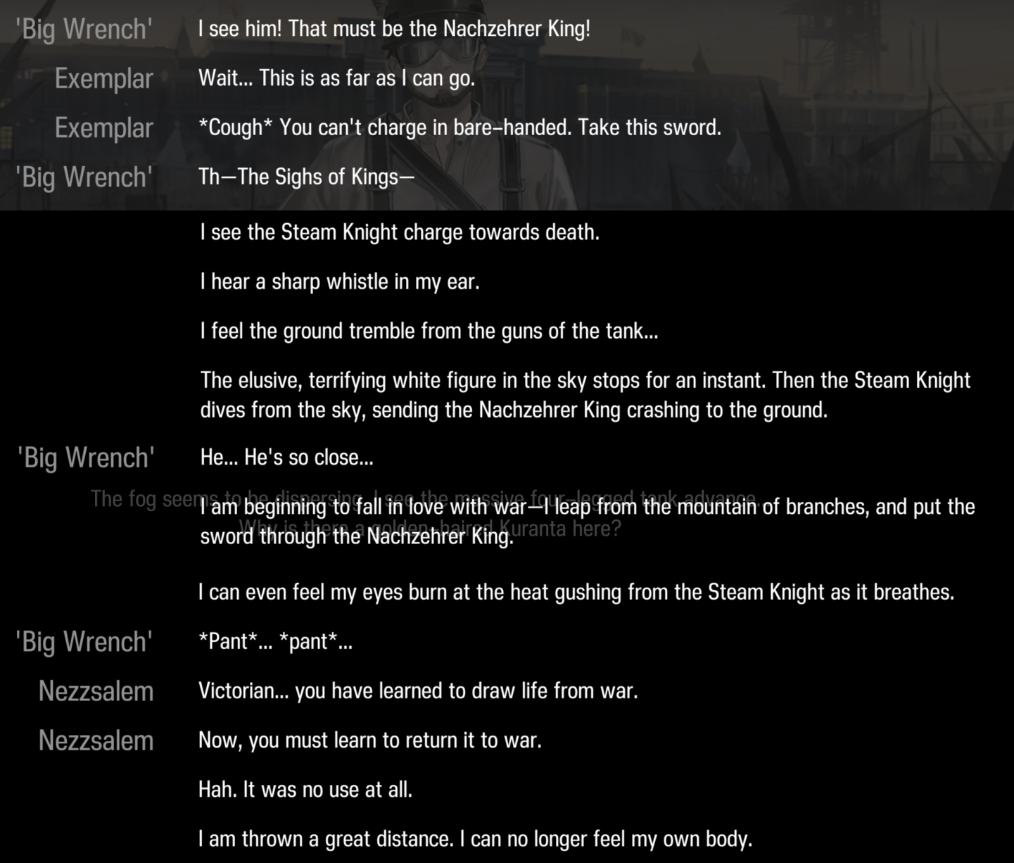 I know it was nezzsalem backed by an entire army, but it's still bullshit that he tanked logos with laqeramaline powerups, the steam knight, bombardments by the duke of wellington's warship, a standoff against eblana, getting run through by the sighs of kings, and then they offscreen him after all of it. the whole narrative is a mess since he was apparently fighting every single person on the battlefield at once
