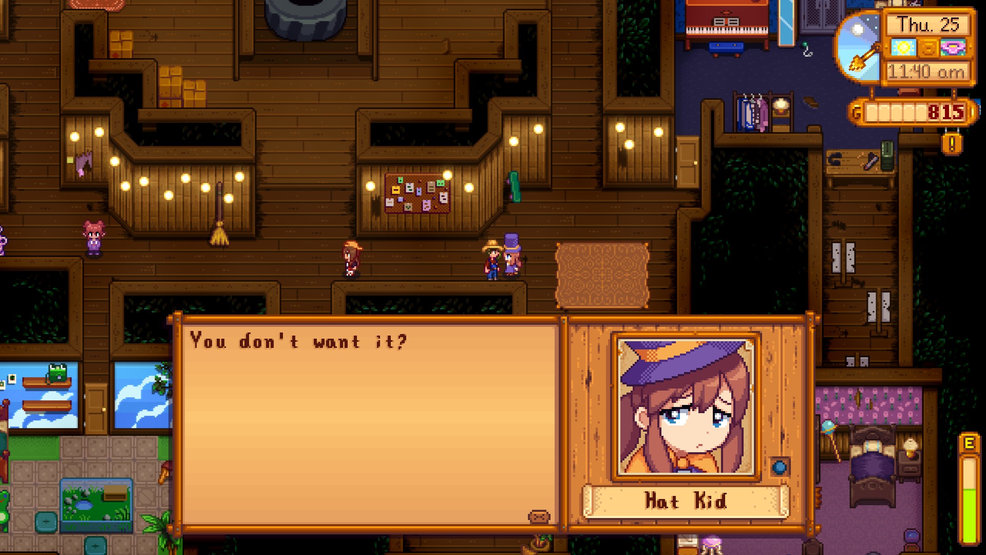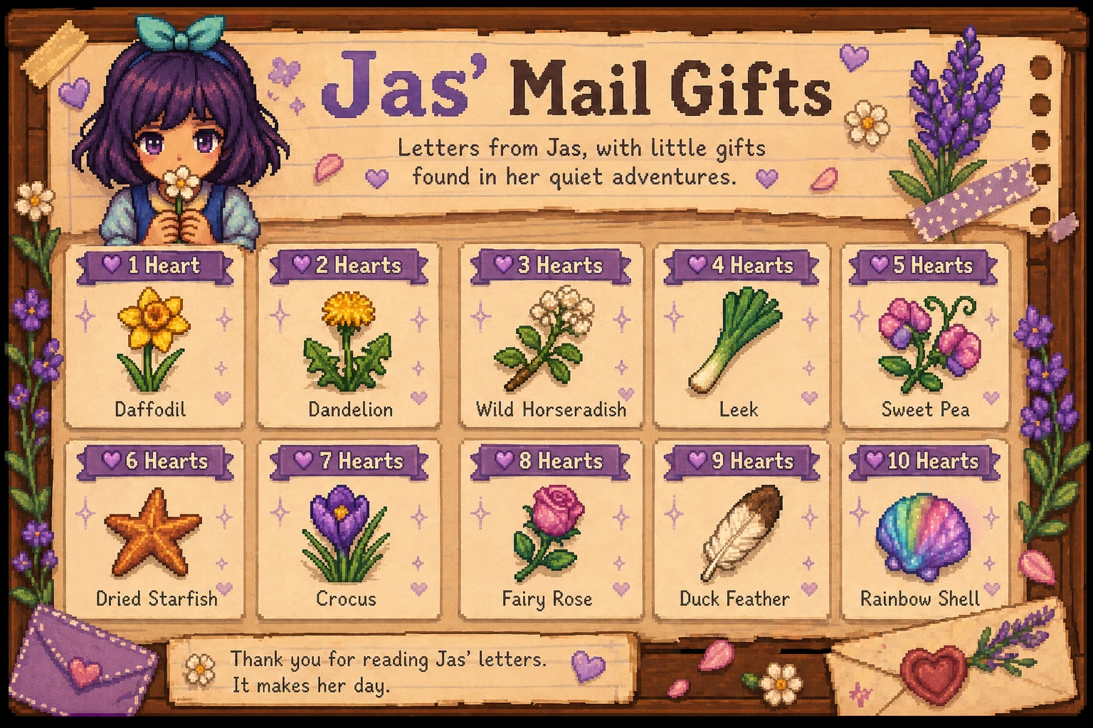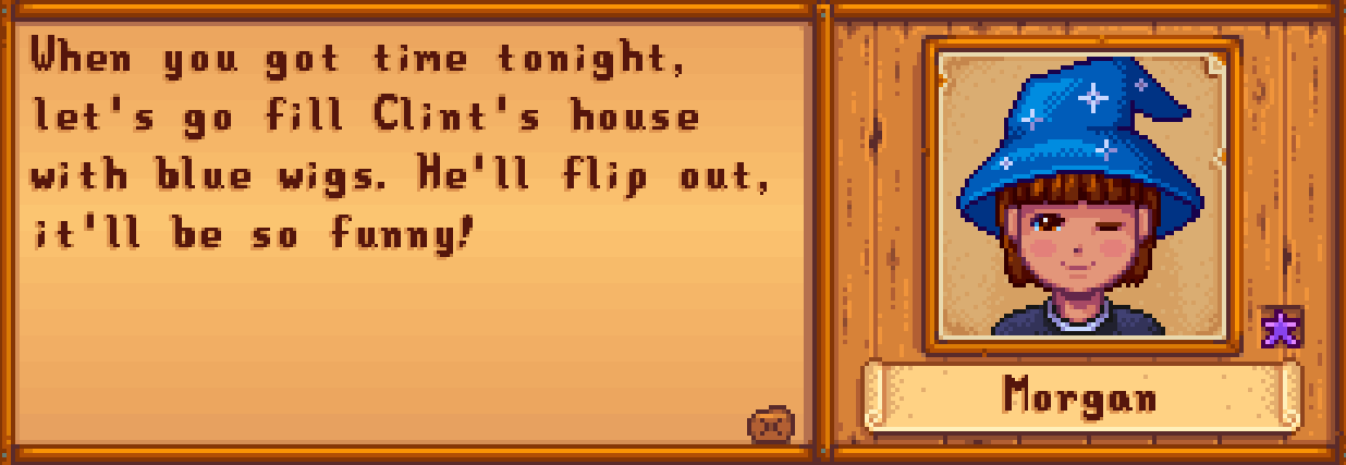 >>565106036No written guide, but I can toss in few things I remember from my personal experiments. Accuracy may vary since it's been a while.>Everyone hates Joja Cola, despite the vending machine being in the treehouse.>Everyone likes ice cream.>Renata likes/loves artifacts. Also loves the fishable frog if you have the Morgan mod that adds them.>Beebz loves chocolate cake. Might also love miners treat, since it's candy like the collectibles in her game.>Carol dislikes bread, calling it stale factory made baguette. Carol hates broccoli. Carol likes blueberry and/or blueberry tart, mentioning a gummy prince from a dream she once had.>Anubia likes expensive stuff in general. Gems are fairly easy to get. I think diamond is on love category above. Gold relic and Gold mask artifacts might also be loved.Hat Kid and Nobeta I have not interacted enough to remember their specific likes or dislikes.HOWEVER, if Hat Kid gives you ice cream on her birthday, do not give it back as a "gift". That saddens her greatly.Rest is up to you to experiment with.