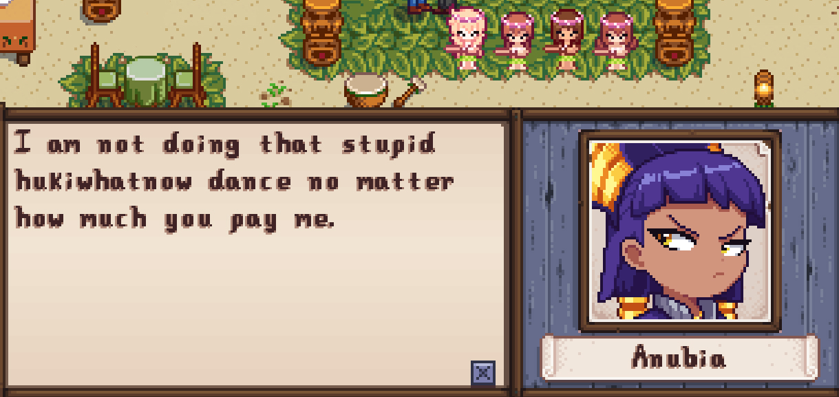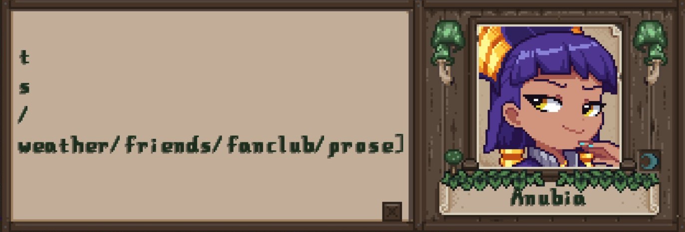 >>565308285Some bugs I found:> Warp to Shearwater Bridge and Orchard are overlapped. > All events are blackscreen, viewport command doesn't seem to work, not sure why.> AntiSocialNPCs is outdated, use 1.6 format instead.> Maps doesn't not recognize summer, fall, winter, I'd recommend remove all duplicate vanilla and daisyneko tilesheet, then add daisyneko as requirement or ship the mod with it. Don't use CustomLocation, use 1.6 format instead.There might be more but I can only find these for now.I highly recommend reorganize everything, currently it's hard to dig through your code.I'll get back to Jas mod for now.