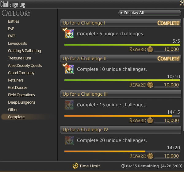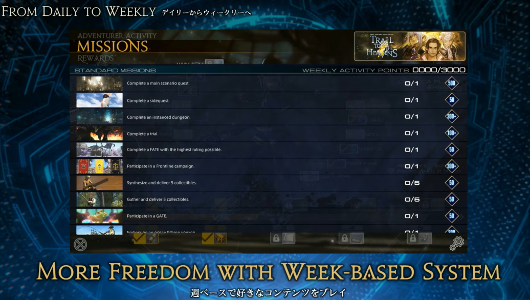 >>564683565First off, imagine being a bitch baby about a sidequest when most of them take a minute to complete at most, second off, who said you have to do sidequests to max your rewards points? all they shown was >>564682751 that screenshot, who is to say that if you do ALL the Standard missions (which in fact, we may get more rare missions) for a week you would get 9000 Activity Points, capping of course at 3000 so you can pinpoint what you want to do. Because I can assure that's going to work solely on the first two missions>Complete a MSQ>Complete a Side questBoth are finite pieces of content, you can catch up with MSQ, or have done every single quest in the game and what, does that mean you are cucked from capping? obviously not, and obviously they are allowing the player to do what they want to increase their points, they even said they are trying to make it more relaxing and not a daily grind.
