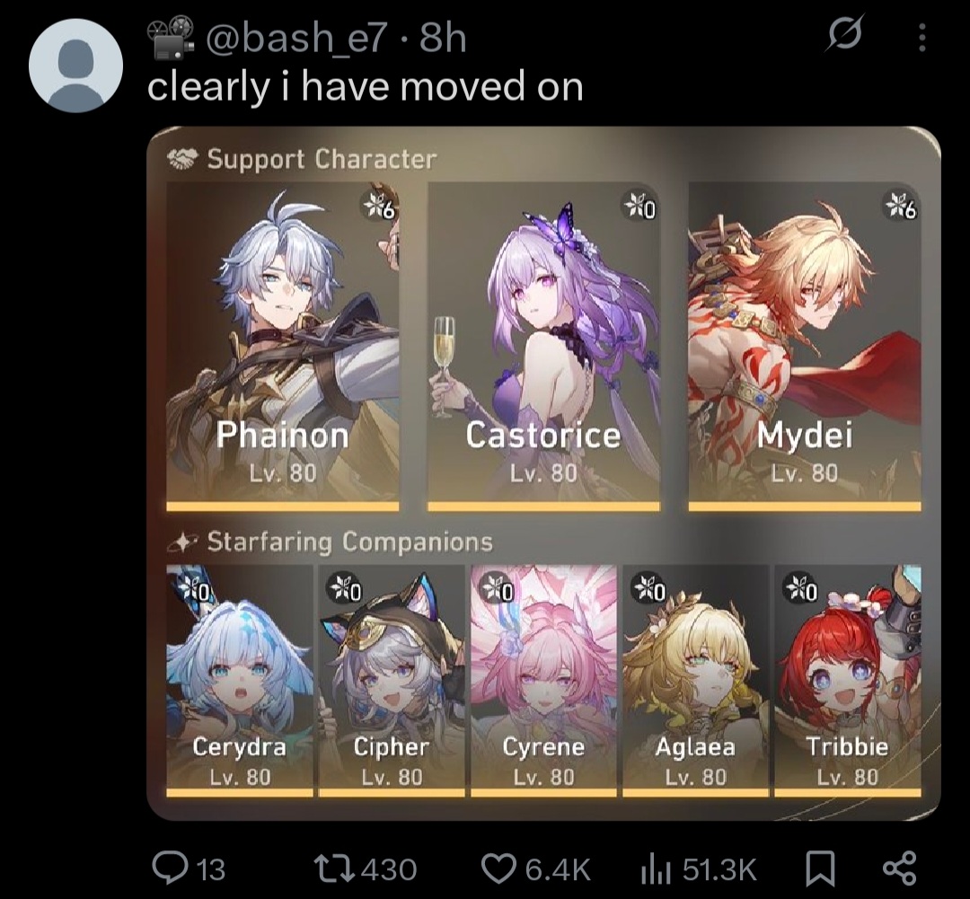 >Current Character Banners: Silver Wolf LV.999, The Dahlia, Castorice, Firefly + Gallagher, Xueyi, Hook - https://www.hoyolab.com/article/44733121