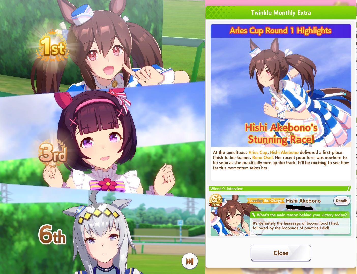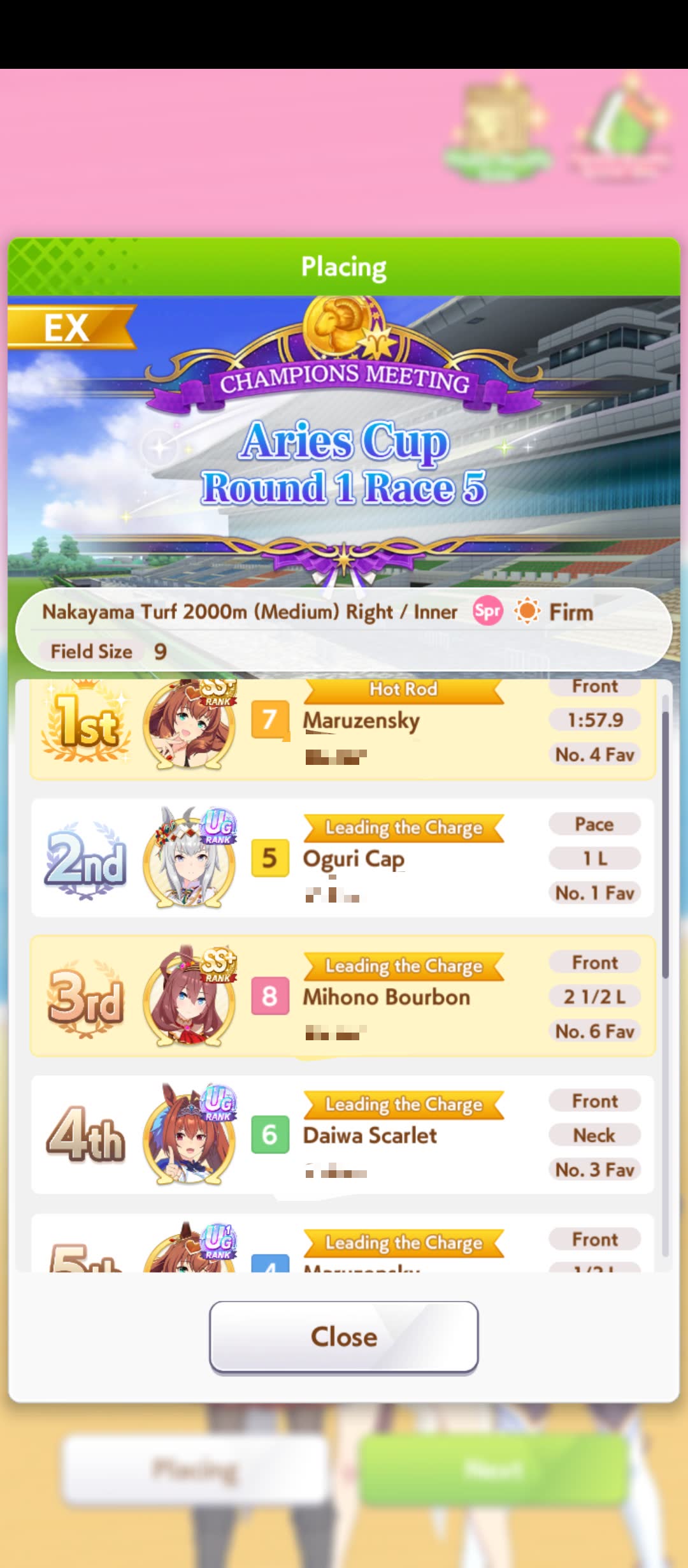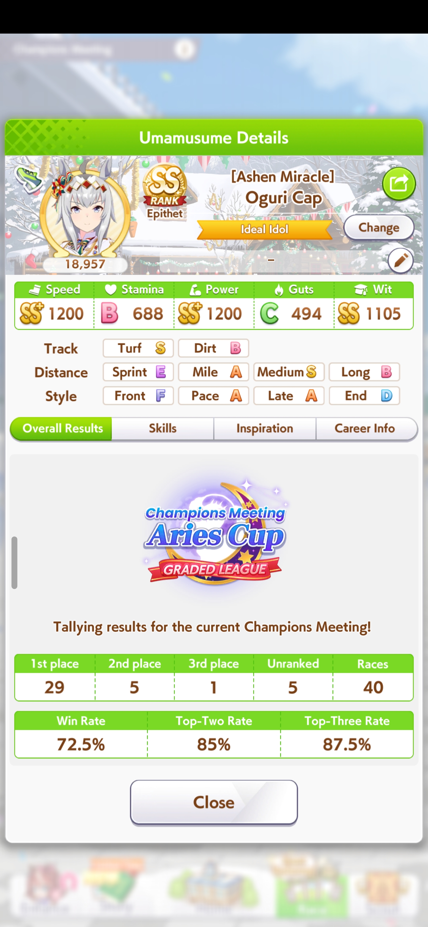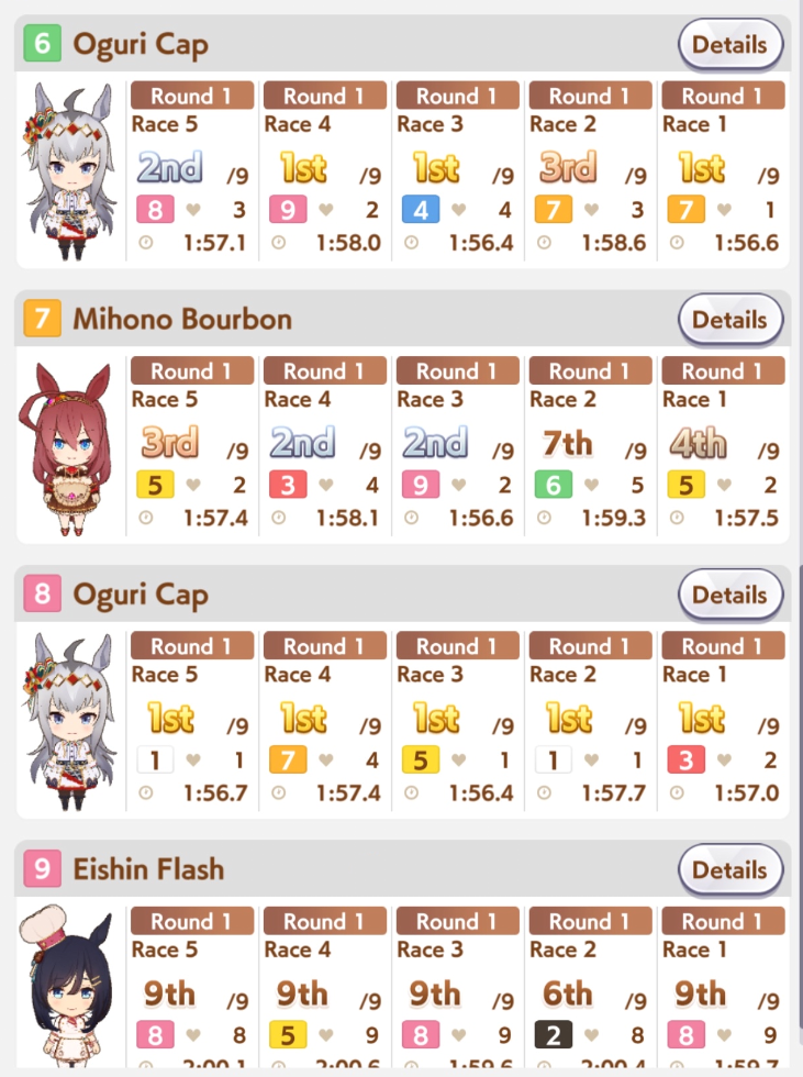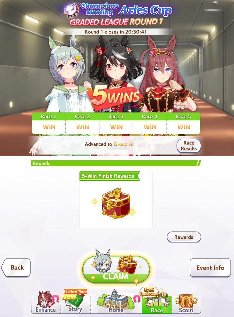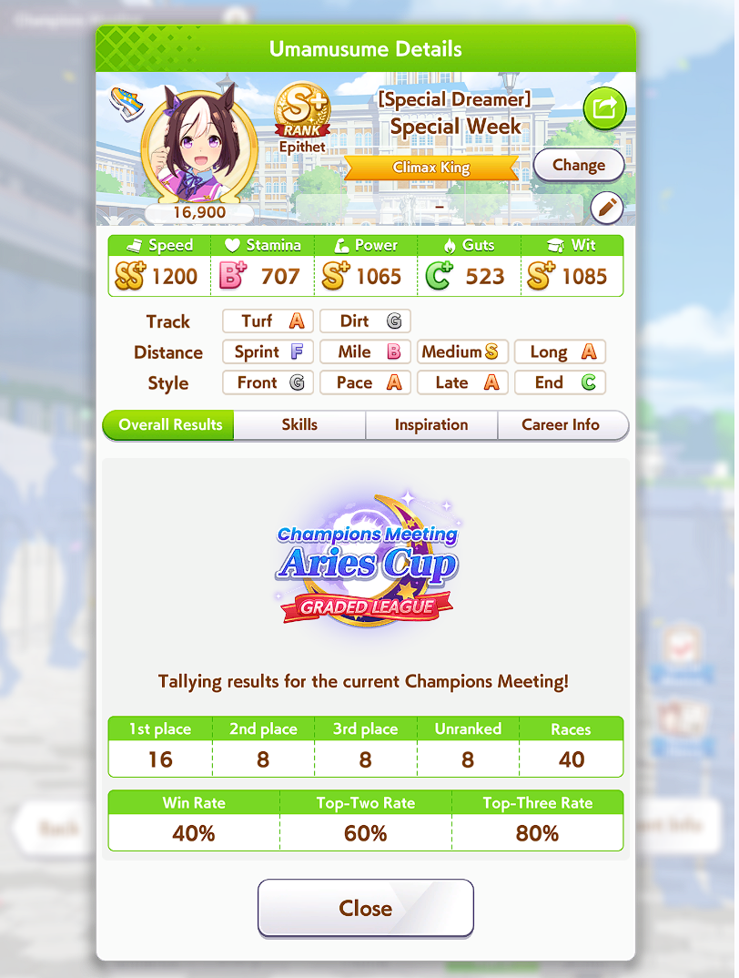 I think my Special Chud did pretty well day 1.30 wins overall between her and my Grass Wonder.